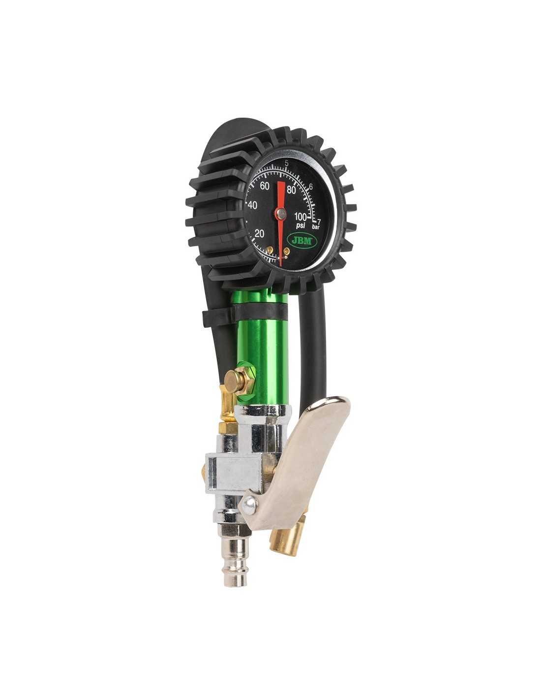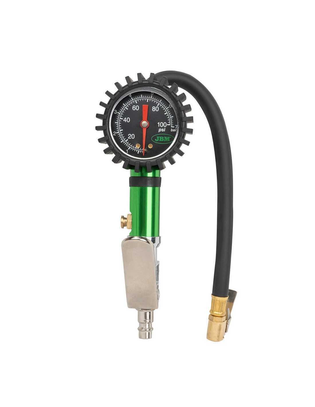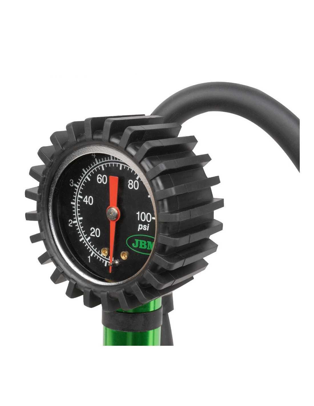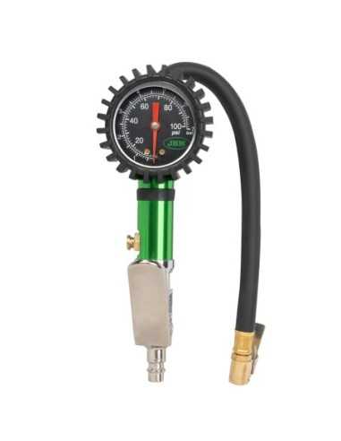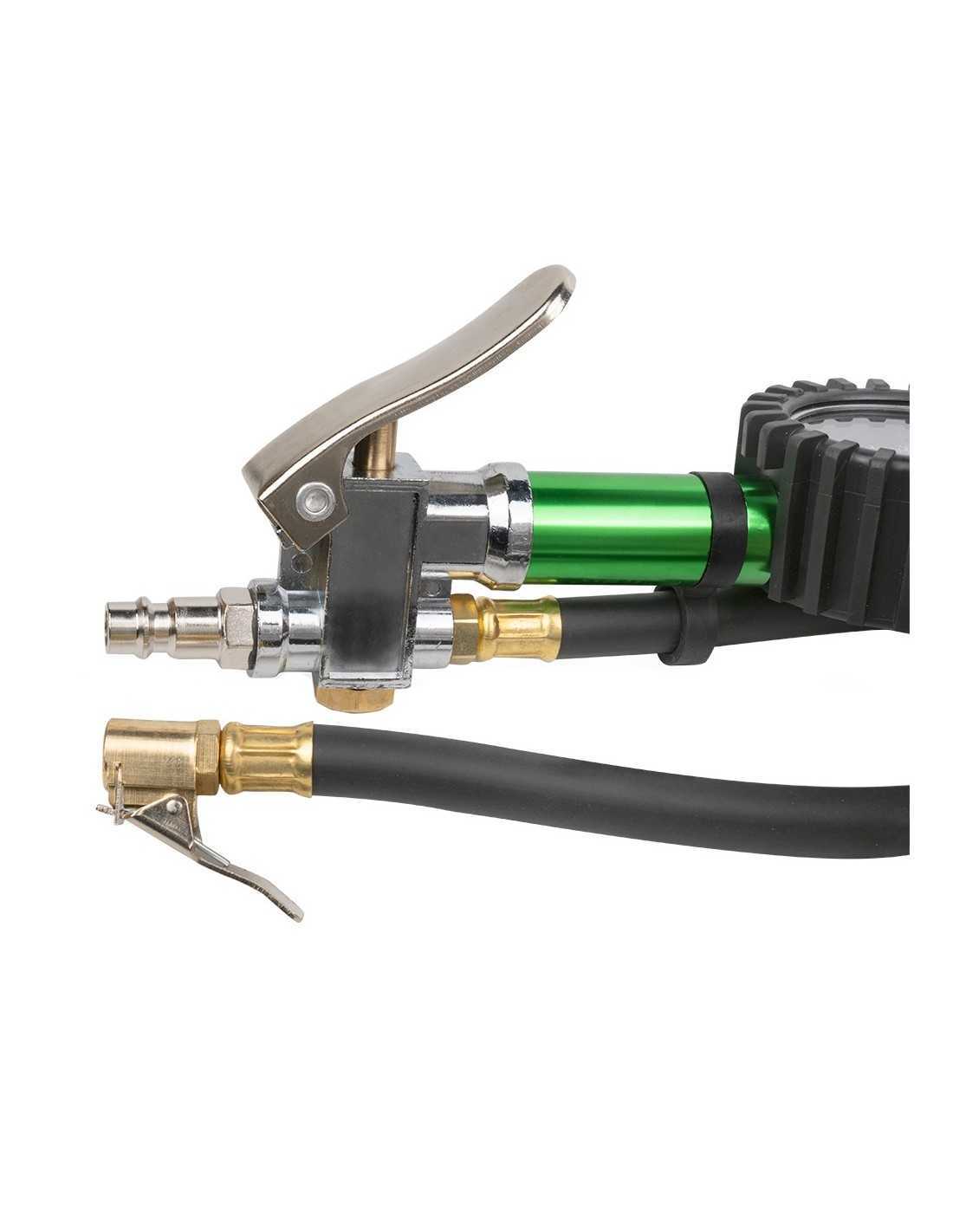 INFLADOR CON CALIBRADORCALIBRE: 0-100PSI / 0-7BARProtector de manómetro de goma.Botón de purga de aire para desinflar . Manguera resistente a torceduras de 300 mm . Clip de aire de latón .