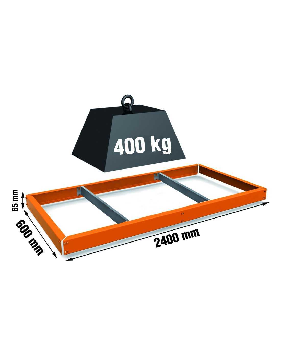 Estante adicional sin tornillos simonforte de medidas 2400x600x30 mm. De color NARANJA. La capacidad de carga es de 400 kgs, certificamos a punto de flexi¢n, no de rotura. No incluye aglomerado ni bandejas de metal. Medidas en uso del producto: 2410x610x65 mm