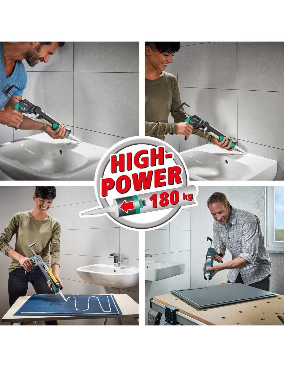 - Presión de descarga de 180 kg: Permite aplicar adhesivos, silicona y acrílicos con facilidad, incluso en materiales resistentes.