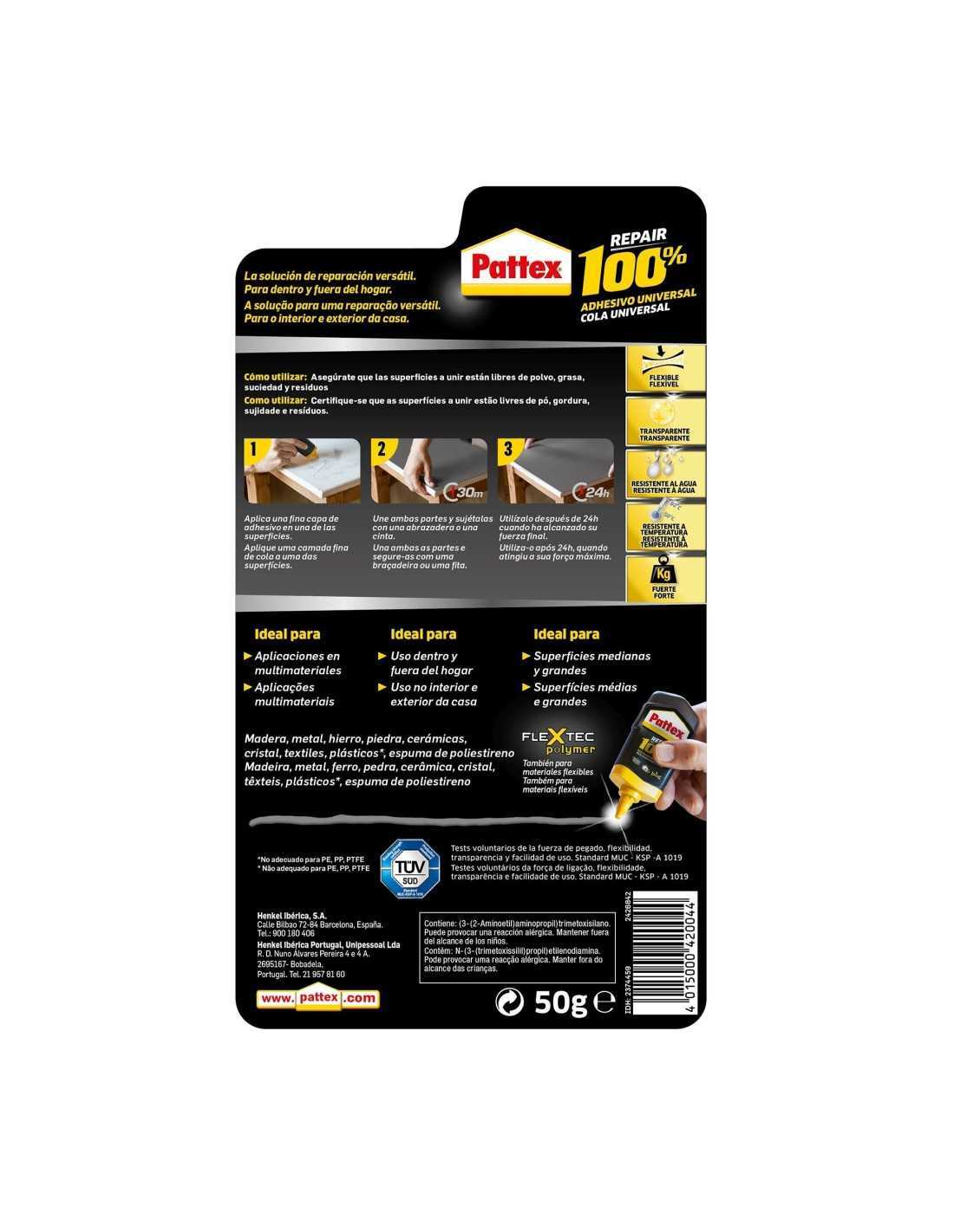Con el pegamento extrafuerte PATTEX 100%, las reparaciones tanto dentro como fuera de casa serán una tarea sencilla. Este adhesivo universal se puede aplicar a la mayoría de materiales* y sirve como pegamento para tela, madera, metal, piedra, cera?mica, vidrio, pla?stico y poliestireno. Su potente fórmula con Power Catalyst lo hace ideal para interiores y exteriores, ya que es resistente al agua, la intemperie y la accio?n de los rayos UV, además de a las temperaturas extremas de -50°C a +110°C. Este adhesivo multiusos se puede utilizar para pegar superficies de tamaño medio y grande, y permite realizar cualquier reparación con rapidez gracias a su práctico tamaño y a su forma ergonómica. Además, el diseño invertido del envase y la base plana permiten guardar el pegamento bocabajo, por lo que siempre está listo para usarlo de inmediato. Este pegamento transparente sin disolventes es un 100% más fuerte desde el primer momento y cuenta con un gran poder de relleno y sellado. Además, gracias al sistema de cierre con clic, siempre podrás asegurarte de que el envase esté bien cerrado.