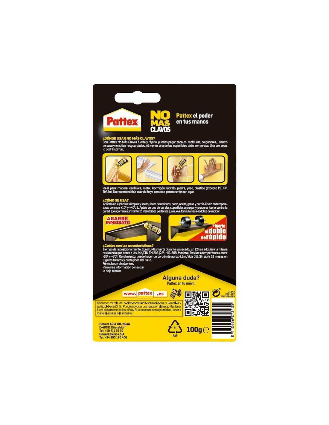 PATTEX No Más Clavos Fuerte y Rápido - ¡Trabajos de bricolaje sin clavos ni tornillos!¿Quieres que tus trabajos de bricolaje y reparación sean más rápidos y sencillos? Con PATTEX No Más Clavos en cartucho, podrás llevar a cabo montajes y uniones sin tener que usar clavos ni tornillos. Al estar elaborado con una tecnología de polímeros a base de agua, este adhesivo de montaje sin disolventes garantiza uniones de fuerza máxima y resultados de calidad. Este adhesivo multiusos es adecuado para materiales de construcción, ya que sirve para unir madera, ladrillo, hormigón, cerámica, metales, vidrio, corcho, PVC rígido o porexpan*. Gracias a su fórmula instantánea y extrafuerte, PATTEX No Más Clavos garantiza trabajos resistentes y es ideal para montar y reparar muebles. Especialmente diseñado para usarlo en interiores, es perfecto para fijar rodapiés, zócalos, frisos, perfiles, encimeras, molduras, paneles decorativos, placas de yeso y para muchos otros usos.
