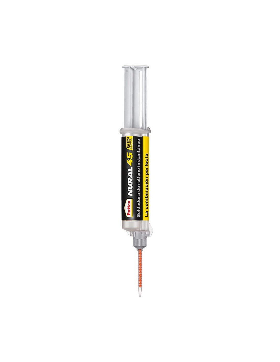 PATTEX Nural 45 – Adhesivo universal bicomponente¿Necesitas un adhesivo que te asegure uniones fuertes en muchos materiales distintos? Gracias a su fórmula a base de cianoacrilato de etilo, PATTEX Nural 45 es resistente al agua, al aceite y a los disolventes habituales, y también a la variación de temperatura de -20 ºC a 80 ºC. Este adhesivo de montaje actúa a modo de soldadura de relleno y ofrece un alto poder de relleno que permite usarlo incluso en holguras de hasta 5 mm. Ideal para pegar, rellenar y reparar de forma permanente múltiples materiales, este pegamento rápido se puede aplicar en metal (hierro, acero, acero inoxidable, aluminio, cobre y latón), goma (caucho, nitrilo, neopreno), plásticos* (ABS, policarbonato, poliamida y PVC), madera, cerámica y cuero, y sirve incluso para holguras de unión y para superficies de contacto irregulares y de difícil acceso. Además, este adhesivo bicomponente no altera su volumen al endurecer.*No apto para PE, PP ni teflón.Se recomienda hacer una prueba en un lugar no visible.