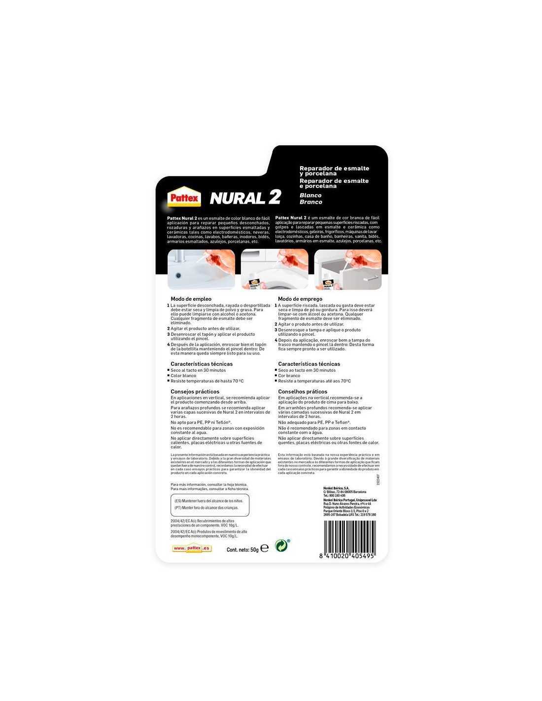El Pattex Nural 2 es un restaurador de porcelana de alta calidad, diseñado para reparar superficies de porcelana, cerámica y esmaltadas. Su fórmula a base de resinas acrílicas proporciona una reparación permanente y duradera, que recupera la apariencia original de la superficie.Este producto es ideal para reparaciones domésticas, bricolaje y manualidades. Puede utilizarse para reparar superficies de porcelana, cerámica y esmaltadas, como bañeras, lavabos, inodoros, platos, tazas, etc. También es perfecto para reparar objetos decorativos, como jarrones, figuras y cerámicas.