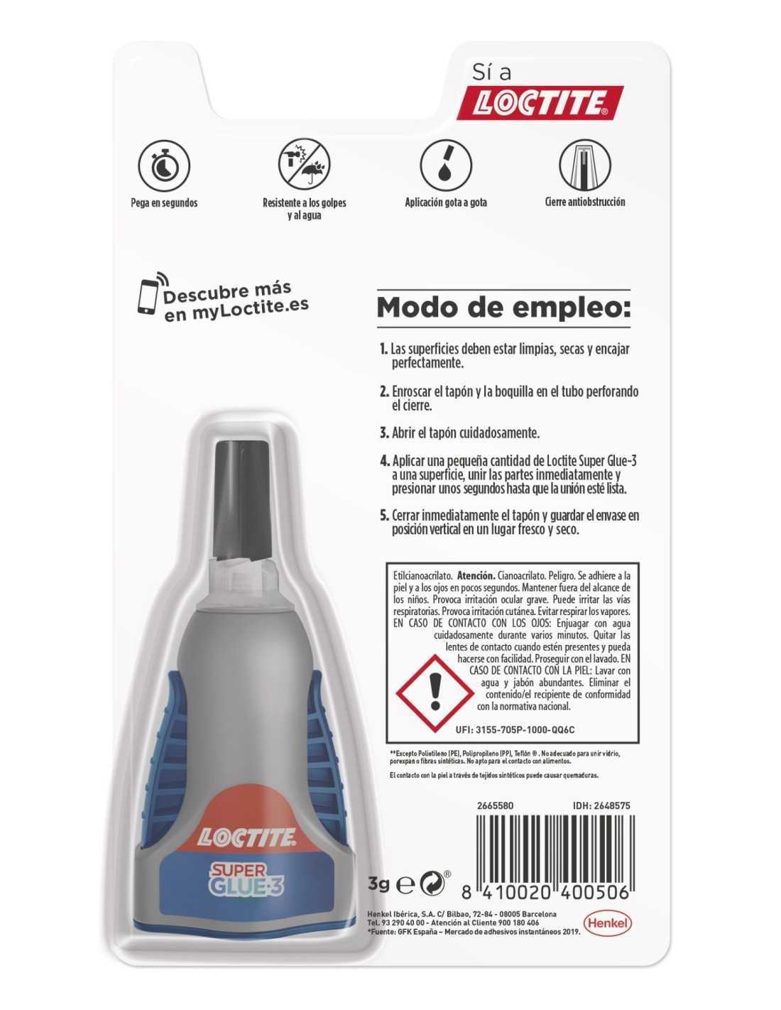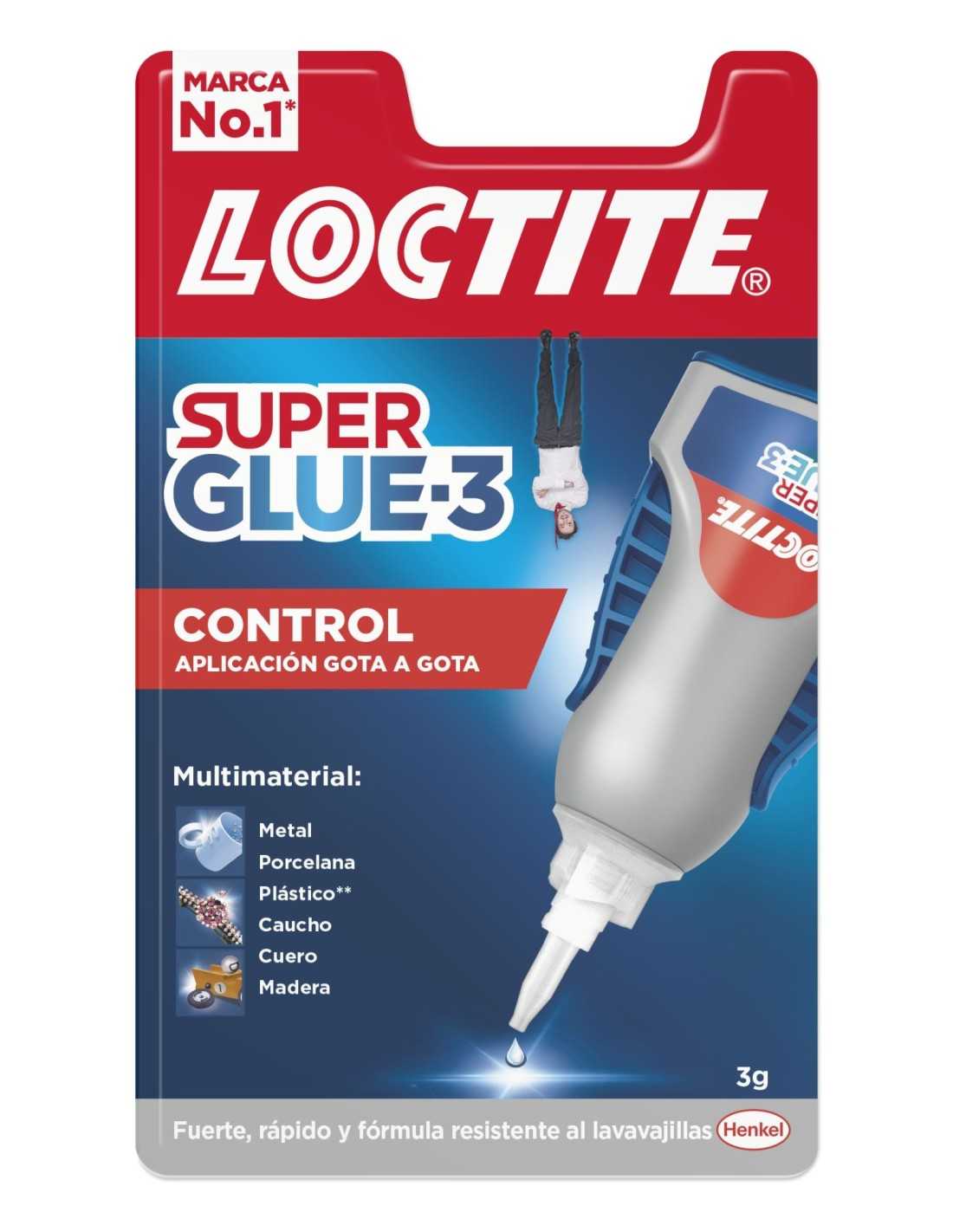LOCTITE SG3 Control es un adhesivo ideal para superficies no porosas y garantiza uniones limpias, transparentes y duraderas en la mayoría de los materiales*. Además, este pegamento extrafuerte con tapón antiobstrucción tiene una fórmula que resiste a todas las condiciones: es resistente al agua y al lavavajillas, a los golpes y a temperaturas (de -50 ºC a 120 ºC). Este adhesivo transparente sin disolventes es ideal para uniones de difícil acceso, ya que cuenta con el exclusivo sistema de dosificación exacta gota a gota. Consigue uniones transparentes en cuestión de segundos y no se seca gracias al cierre de seguridad con sistema de bloqueo con doble clic. *Excepto polietileno (PE), polipropileno (PP), porexpan, Teflón y fibras sintéticas. Se recomienda hacer una prueba en un lugar no visible. No apto para reparaciones eléctricas