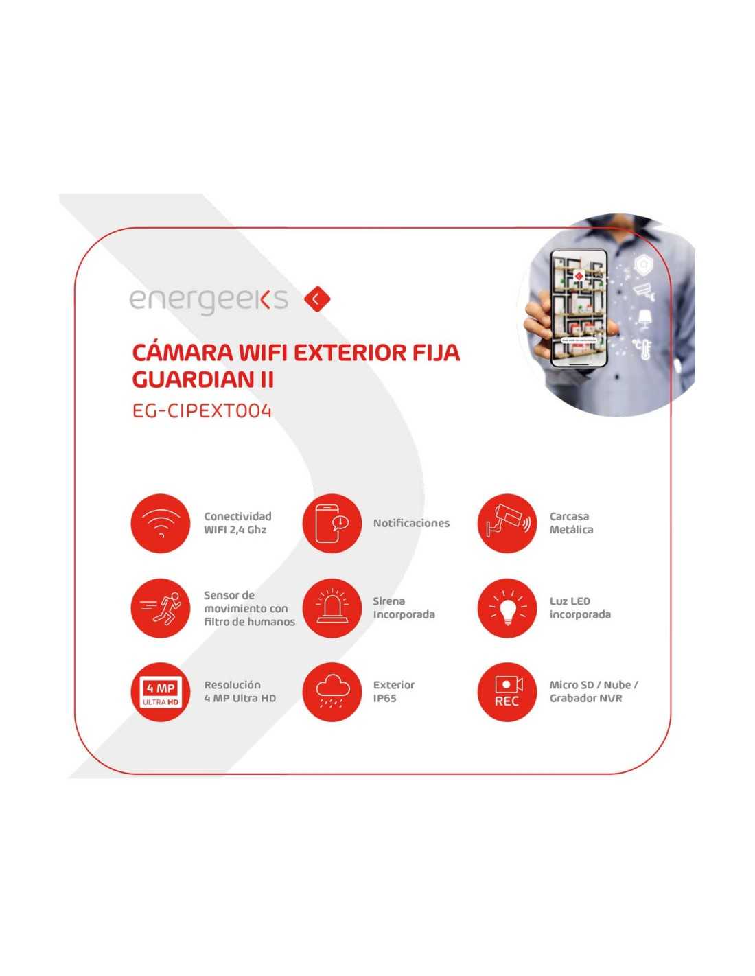 La Cámara WiFi Fija Exterior Guardian II ENERGEEKS EG-CIPEXT004 es una solución de videovigilancia de alta calidad diseñada para proteger tu hogar, jardín, negocio, mascotas o seres queridos. Esta cámara ofrece una vigilancia continua y fiable con una calidad de imagen excepcional gracias a su resolución Ultra HD de 4 megapíxeles. Su sencilla instalación permite una configuración rápida y un control intuitivo a través de una aplicación móvil, permitiéndote la visualización en directo desde cualquier lugar.