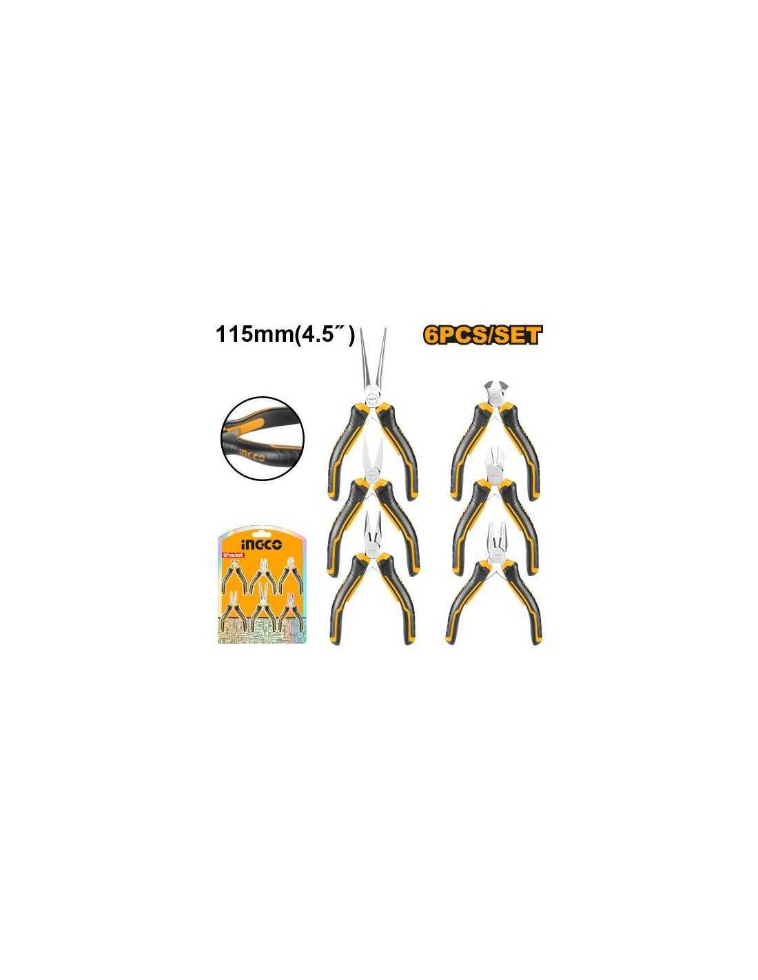 El SET MINIALICATES PRECISIÓN 6 PCS 115MM INGCO HMPS06115 es una colección de alicates de alta calidad diseñados para ofrecer precisión y versatilidad en trabajos manuales y de bricolaje. Este set incluye un alicate universal, un alicate de corte diagonal, un alicate de corte frontal, un alicate boca plana, un alicate boca semiredonda y un alicate boca semiredonda larga, todos fabricados con aleación CR-V (50BV30) tratada térmicamente. Además, cuentan con mangos compuestos de dos componentes de material polimérico para garantizar un agarre seguro y evitar el deslizamiento durante su uso.