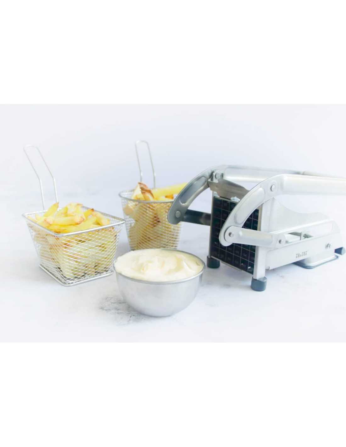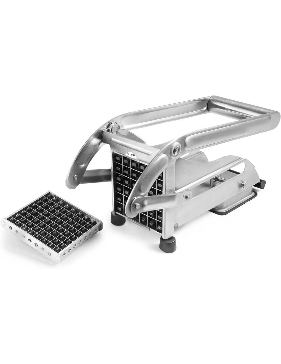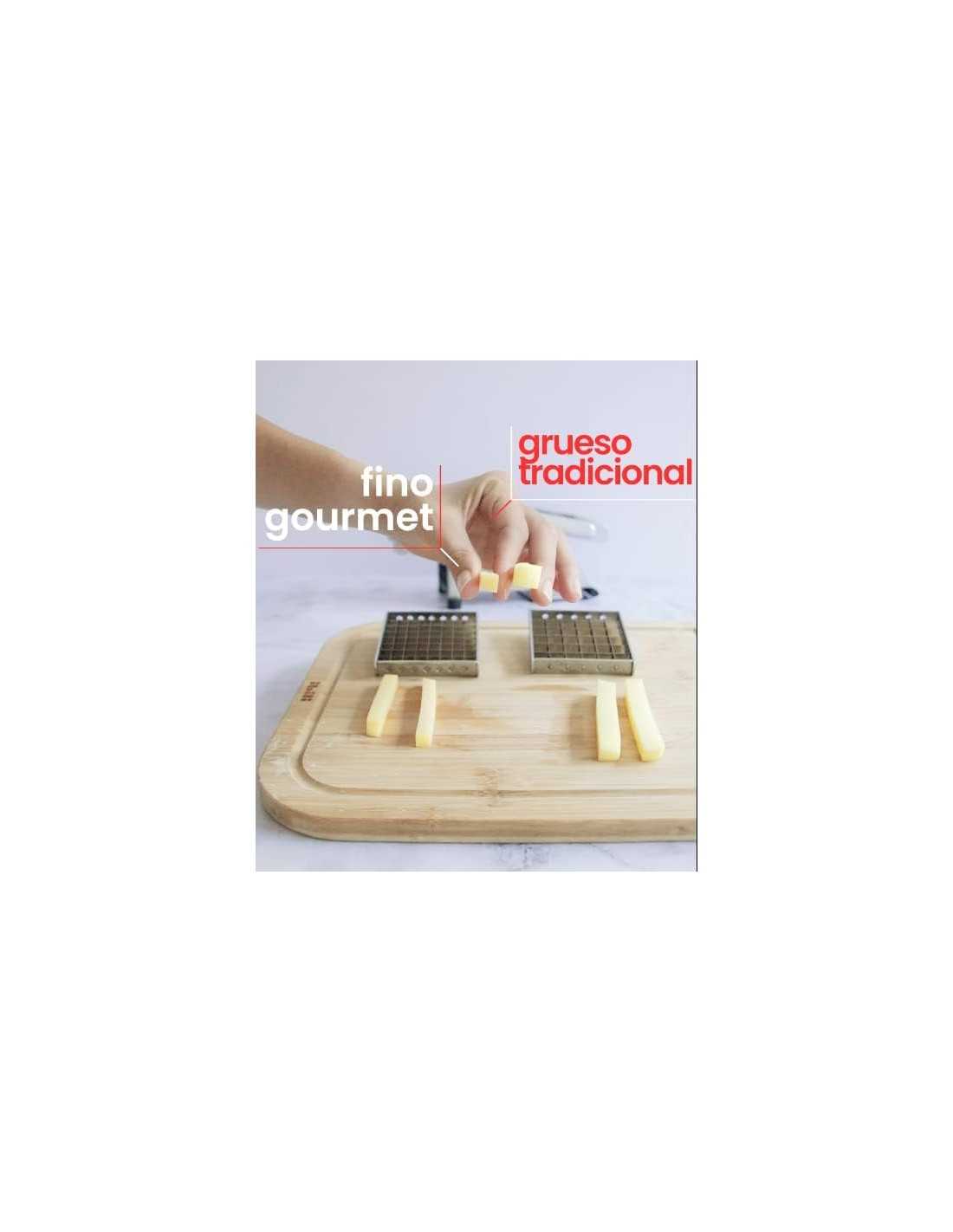- Sistema de Cuchillas Intercambiables: Incluye dos rejillas de corte de alta precisión: una de 9 mm (para 54 cubos finos) y otra de 12 mm (para 36 cubos gruesos), permitiendo adaptar el grosor de la patata al gusto del comensal.