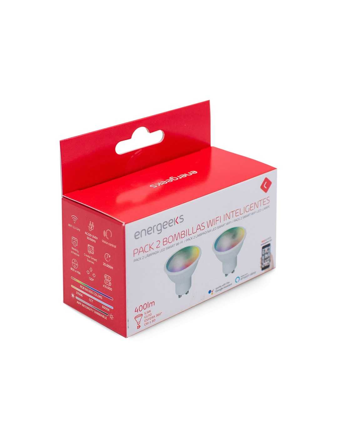 El PACK 2 bombillas LED wifi inteligentes GU10 5W 400LM CCT (2700-6500K) dimable & RGB te ofrece una solución de iluminación inteligente y versátil para transformar el ambiente de tu hogar. Este pack incluye dos bombillas LED con casquillo GU10, cada una con una potencia de 5W y un flujo luminoso de 400 lúmenes, proporcionando una iluminación eficiente y adecuada para diferentes espacios. La principal ventaja de estas bombillas reside en su capacidad para ofrecer tanto luz blanca ajustable (CCT) como luz de color (RGB), lo que te permite crear la atmósfera perfecta para cada ocasión.