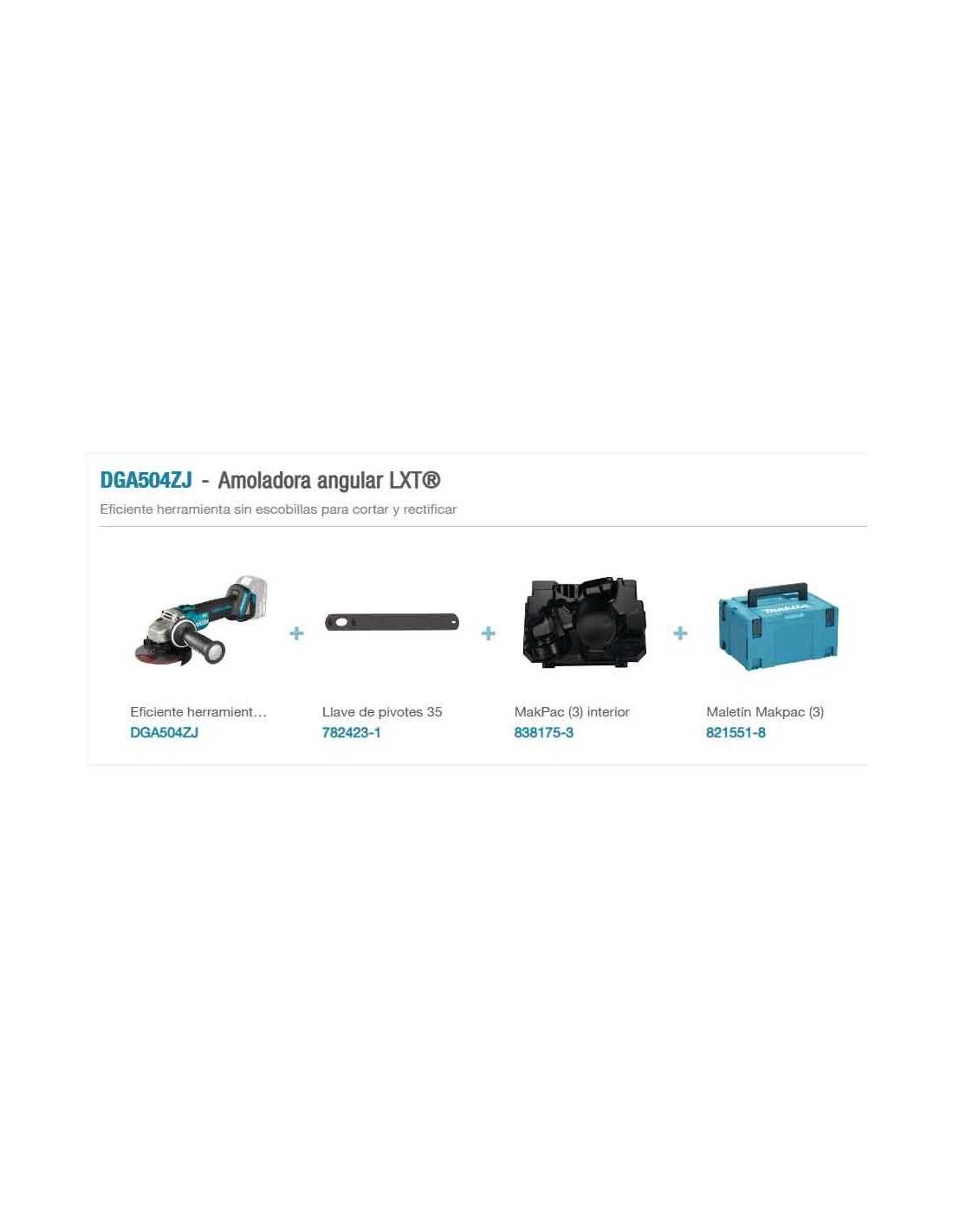 A diferencia de la DGA504 RMJ, esta versión se entrega como solo máquina, sin batería ni cargador, pero con maletín Makpac para transporte. Está orientada a profesionales que ya utilizan la plataforma LXT 18V y desean ampliar su equipamiento sin duplicar accesorios.