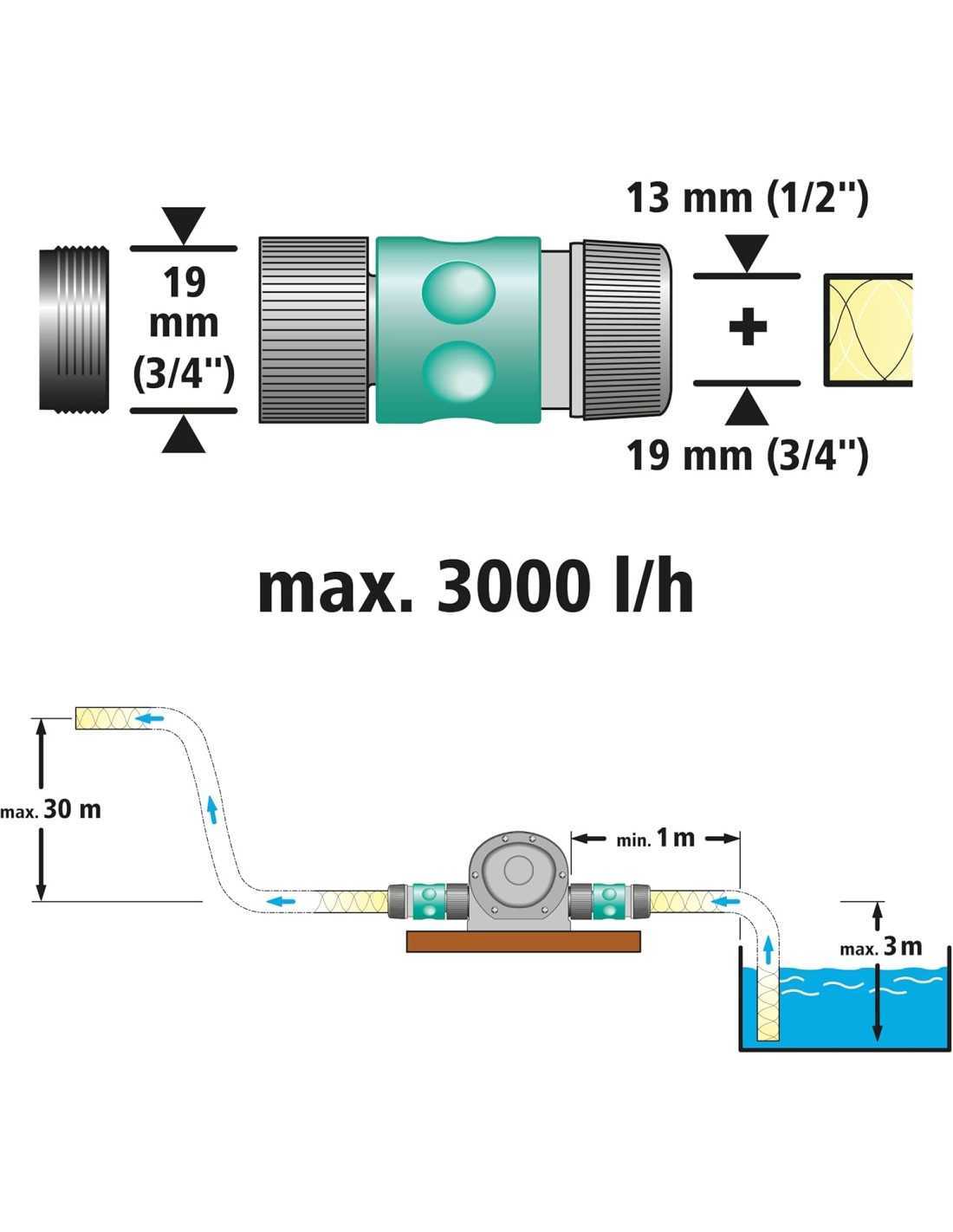 Con una capacidad de bombeo de hasta 3.000 litros por hora, esta bomba es ideal para tareas domésticas y de jardinería. Su conexión para mangueras de 13 mm o 19 mm permite una gran versatilidad, y su altura de aspiración de hasta 3 metros y altura de impulsión de hasta 30 metros aseguran un rendimiento óptimo en diversas situaciones. Además, su fabricación en Europa garantiza calidad y fiabilidad en cada uso.
