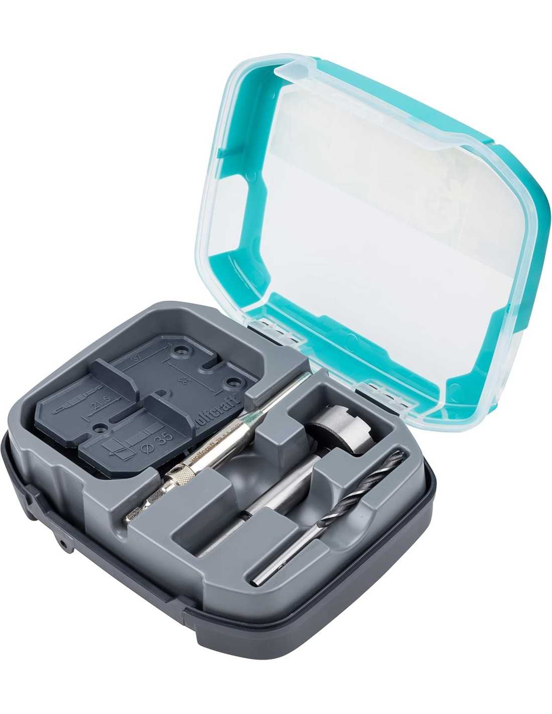 El set se compone de dos plantillas de taladrado que facilitan la alineación y el marcado de las posiciones de taladrado, una broca Forstner de 35 mm para taladrar el orificio de la cazoleta, una broca autocentrante de 2,5 mm para realizar orificios centrados y una broca espiral de madera de 5 mm para pretaladrar los orificios de los tornillos. Todas las herramientas se almacenan de forma ordenada y segura en una caja de dos componentes de alta calidad, lo que facilita su transporte y evita pérdidas.