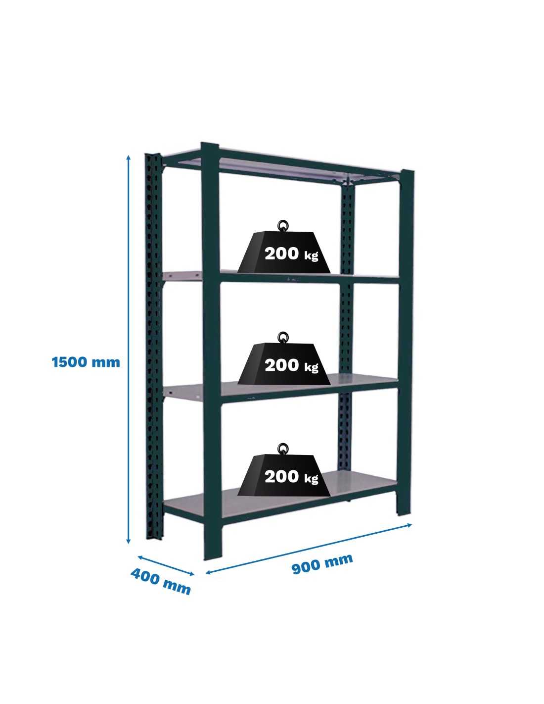 Estantería metálica sin tornillos con bandeja metálica, de color antracita/galva. M¢dulo inicial. Tiene 4 estantes. Las dimensiones de esta estantería son: 1500x900x400 mm. Y tiene una capacidad de carga de 200 kgs por estante. Es fabricado en España y se monta rápido siguiendo las instrucciones.