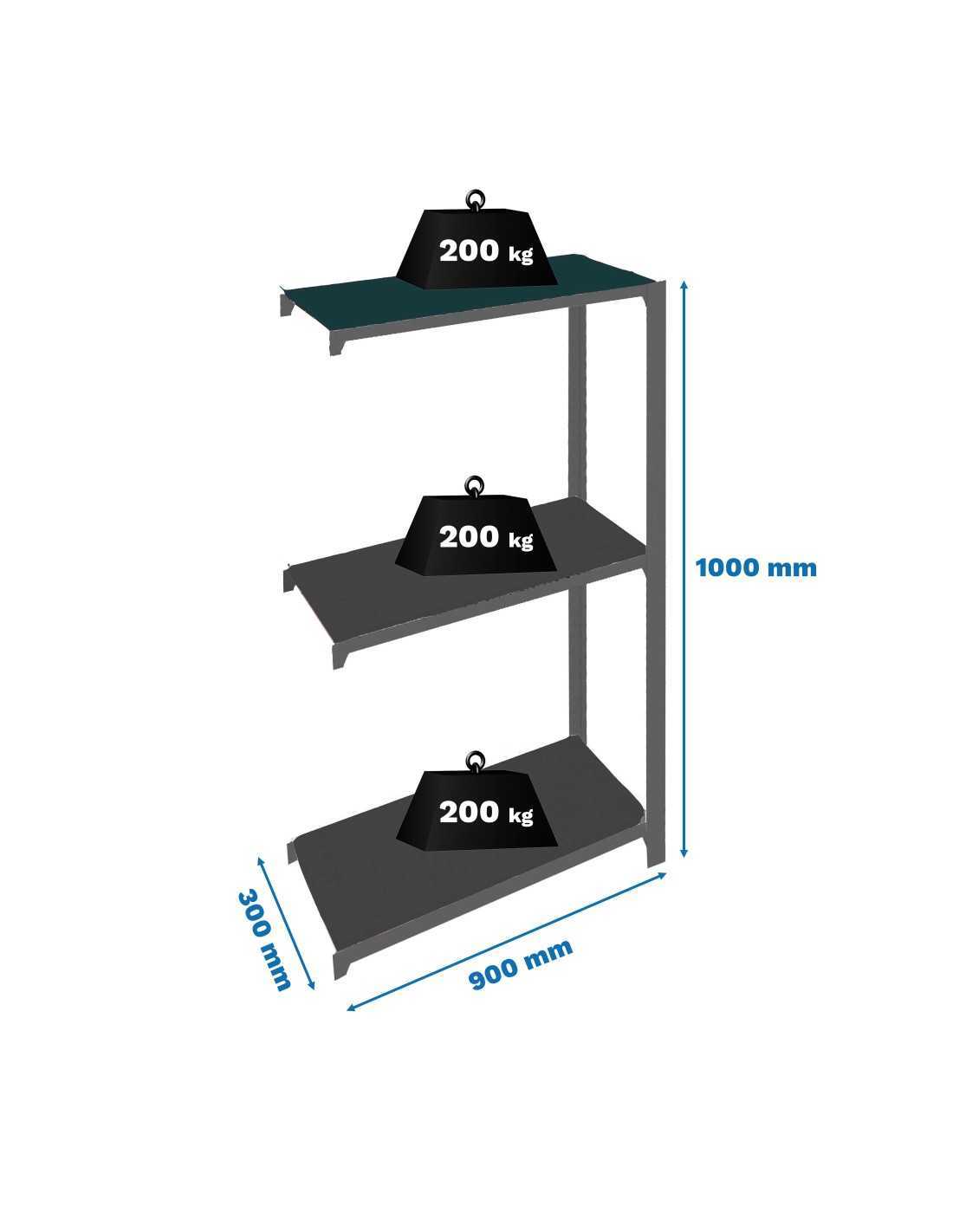 Estantería metálica sin tornillos con bandeja metálica, de color antracita/antracita. M¢dulo adicional (requiere m¢dulo inicial). Tiene 3 estantes. Las dimensiones de esta estantería son: 1000x900x300 mm. Y tiene una capacidad de carga de 200 kgs por estante. Es fabricado en España y se monta rápido siguiendo las instrucciones.