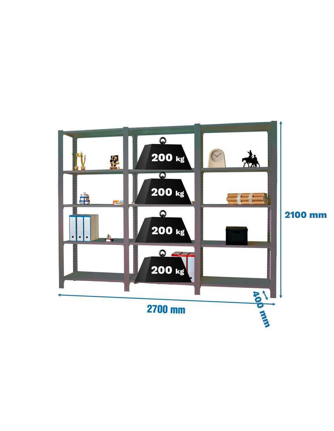 Pack de estanterías metálicas sin tornillos con bandeja metálica (m¢dulo inicial + adicional + adicional), de color antracita/antracita.tiene 5 estantes. Las dimensiones de esta estantería son: 2100x900x400 mm. Y tiene una capacidad de carga de 200 kgs por estante. Es fabricado en España y se monta rápido siguiendo las instrucciones.