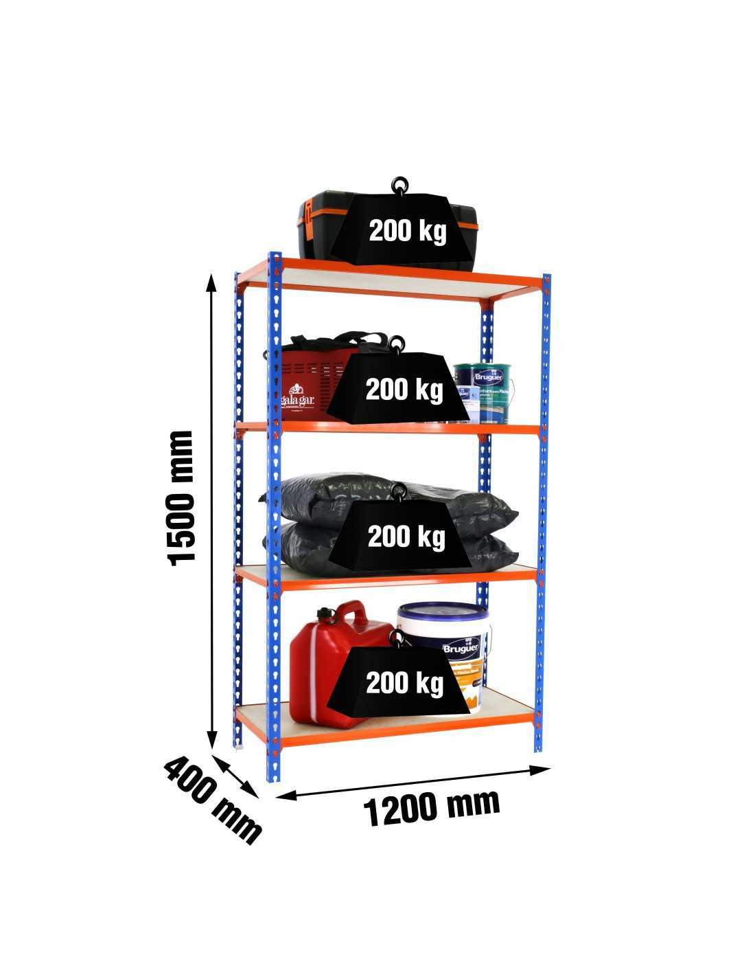 Incluye baldas de madera tipo chipboard con una capacidad de carga de hasta 300 kg por nivel, lo que garantiza un excelente rendimiento para herramientas, cajas, productos de almacén o uso general.
