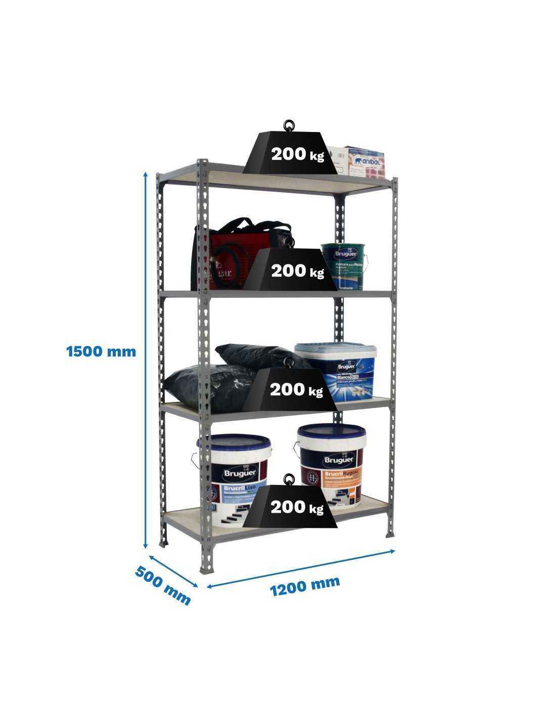 Incluye baldas de madera tipo chipboard con una capacidad de carga de hasta 300 kg por nivel, lo que garantiza un excelente rendimiento para herramientas, cajas, productos de almacén o uso general.
