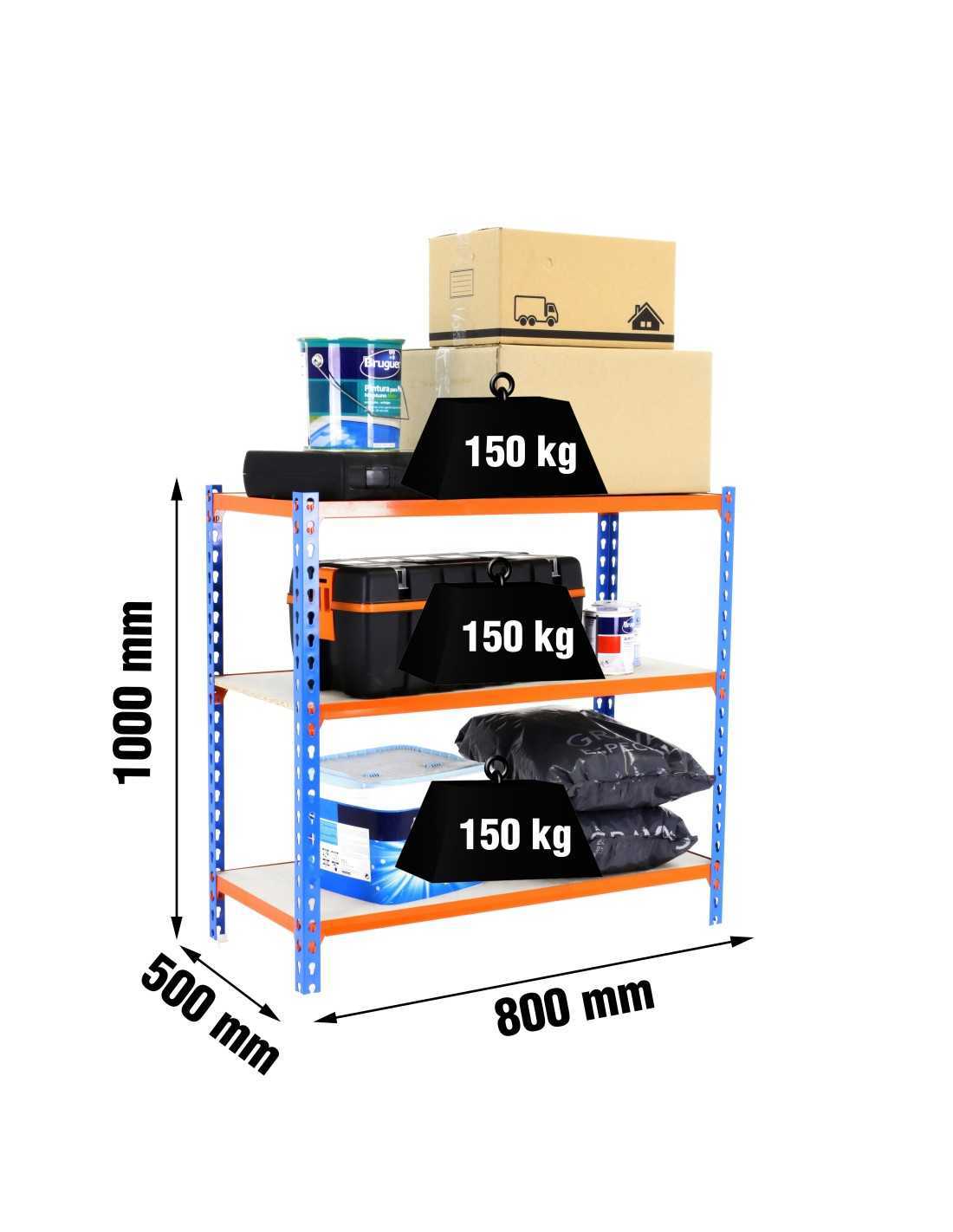 Incluye baldas de madera tipo chipboard con una capacidad de carga de hasta 300 kg por nivel, lo que garantiza un excelente rendimiento para herramientas, cajas, productos de almacén o uso general.
