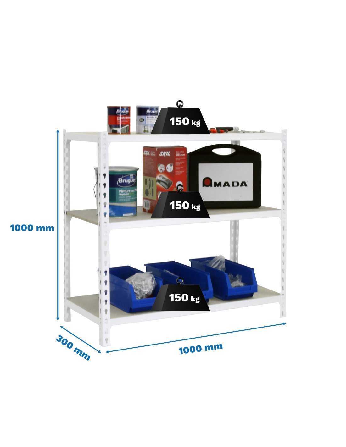 Incluye baldas de madera tipo chipboard con una capacidad de carga de hasta 300 kg por nivel, lo que garantiza un excelente rendimiento para herramientas, cajas, productos de almacén o uso general.
