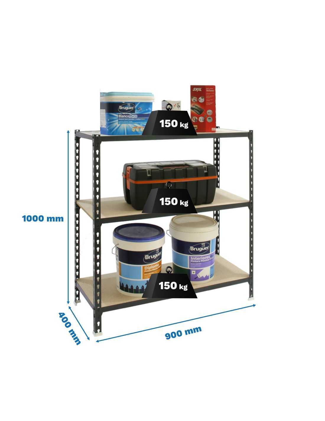 Incluye baldas de madera tipo chipboard con una capacidad de carga de hasta 300 kg por nivel, lo que garantiza un excelente rendimiento para herramientas, cajas, productos de almacén o uso general.