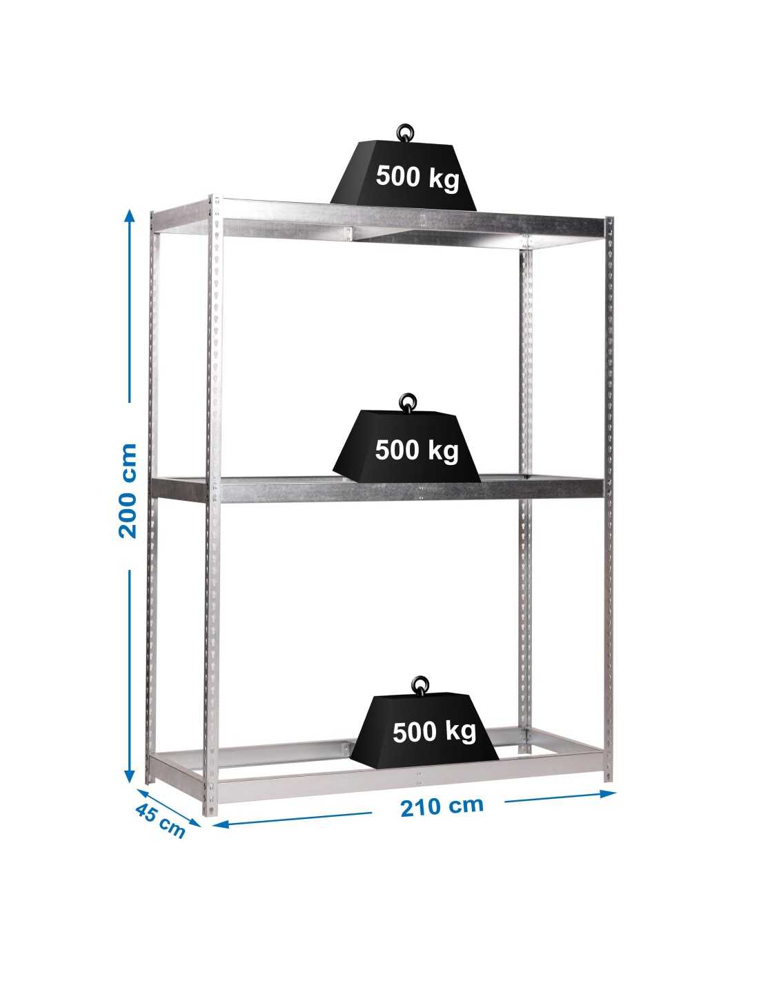 Estanteria metalica sin tornillos con 3 estantes. No contiene ni bandejas de aglomerado ni bandejas de metal. Estanteria que se monta de forma facil y comoda gracias a su sistema de click, sin tornillos simplemente con la ayuda de un martillo podras tener esta estanteria montada en aproximadamente 12 minutos. Tienes a tu disposicion un video detallado de montaje en Youtube. La capacidad de carga de cada uno de los estantes es de 500 kgs. Contiene dos refuerzos por estante. Contiene un recubrimiento plastico y acabado en epoxypoliester. Ademas es muy facil de limpiar. Manipulaci¢n del producto sin aristas de corte, sin riesgos de manipulacion. Es un producto fabricado en España. Medidas en uso del producto: 1975x2110x460 mm