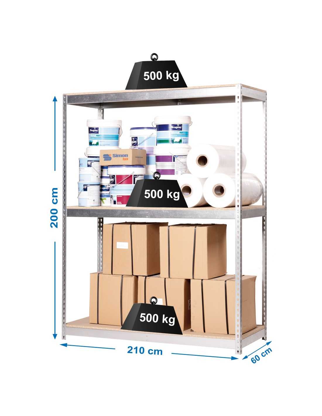 Estantería metálica sin tornillos de color galva/madera con capacidad de carga por estante de 500 kg. Tiene 3 alturas. Contiene 6 baldas de aglomerado, 2 baldas para cada altura, una de las baldas más larga que la otra. Incluye 1 refuerzo por altura. Las medidas (alto x ancho x fondo) son 2000x2100x600 mm. Tiene bandejas de aglomerado de 12 mm. Producto español, calidad europea, podrás encontrar las intrucciones de montaje en su interior. Medidas en uso del producto: 1975x2110x610 mm