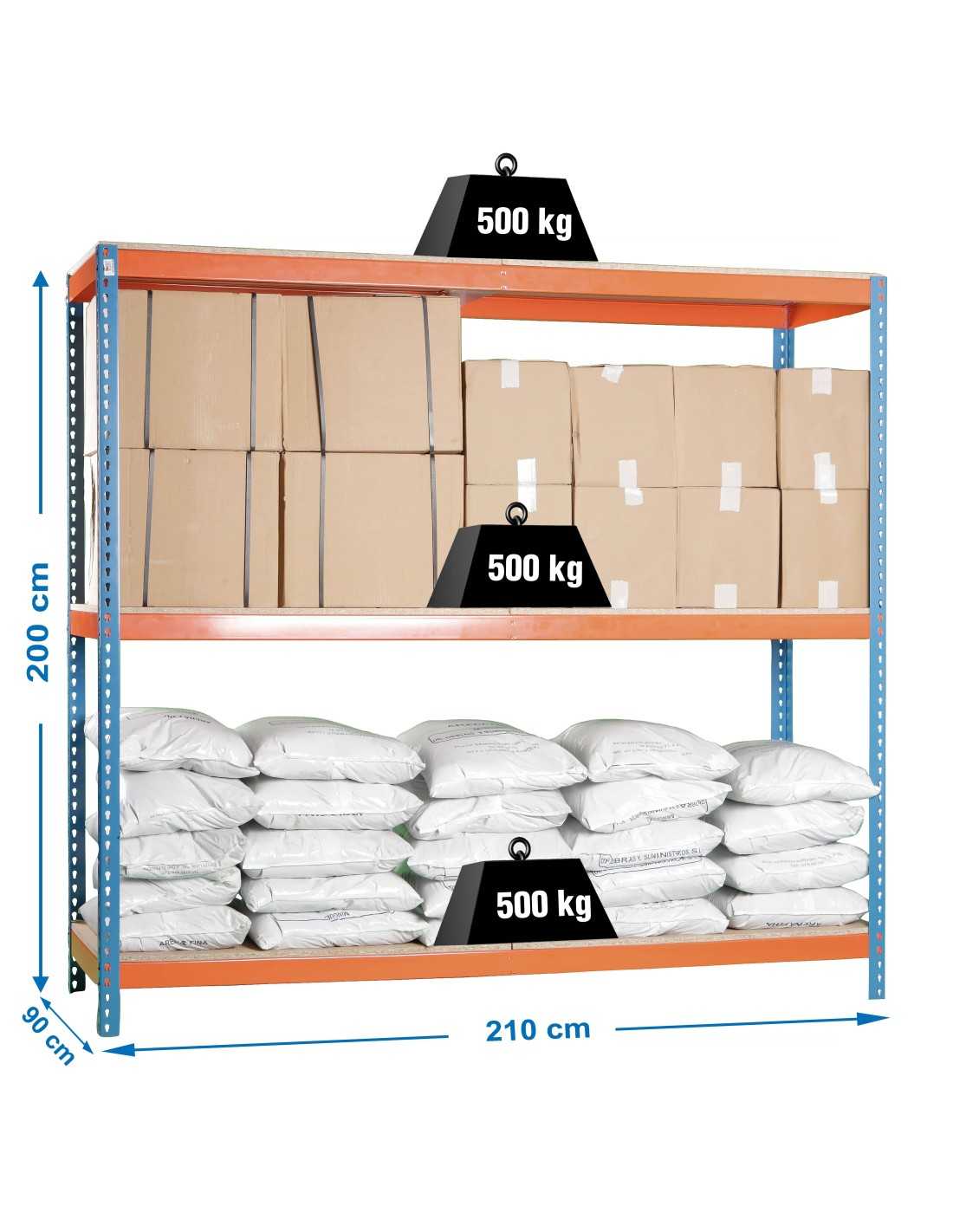 Estantería metálica sin tornillos de color azul/naranja/madera con capacidad de carga por estante de 500 kg. Tiene 3 alturas. Contiene 6 baldas de aglomerado, 2 baldas para cada altura, una de las baldas más larga que la otra. Incluye 1 refuerzo por altura. Las medidas (alto x ancho x fondo) son 2000x2100x900 mm. Tiene bandejas de aglomerado de 12 mm. Producto español, calidad europea, podrás encontrar las intrucciones de montaje en su interior. Medidas en uso del producto: 1975x2110x910 mm