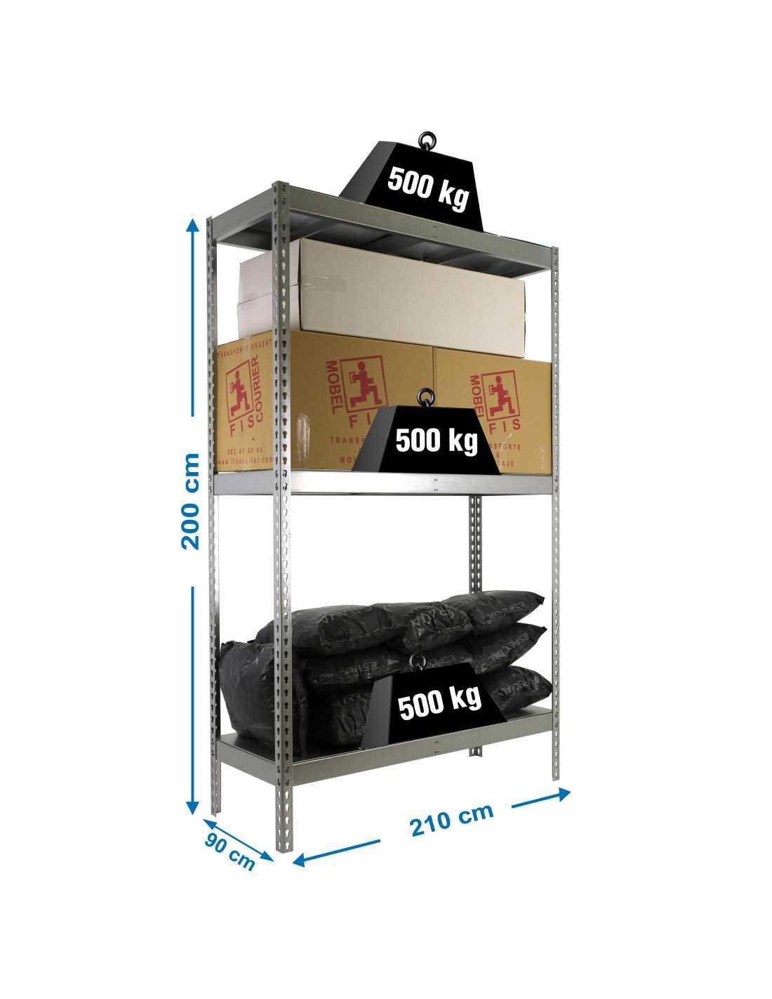 Estantería metálica sin tornillos de color galva/galva con capacidad de carga por estante de 500 kg. El número de estantes es 3 y las medidas (alto x ancho x fondo) son 2000x2100x900 mm. No incluye estantes. Producto español, calidad europea, podrás encontrar las instrucciones de montaje en su interior. Medidas en uso del producto: 1975x2110x910 mm