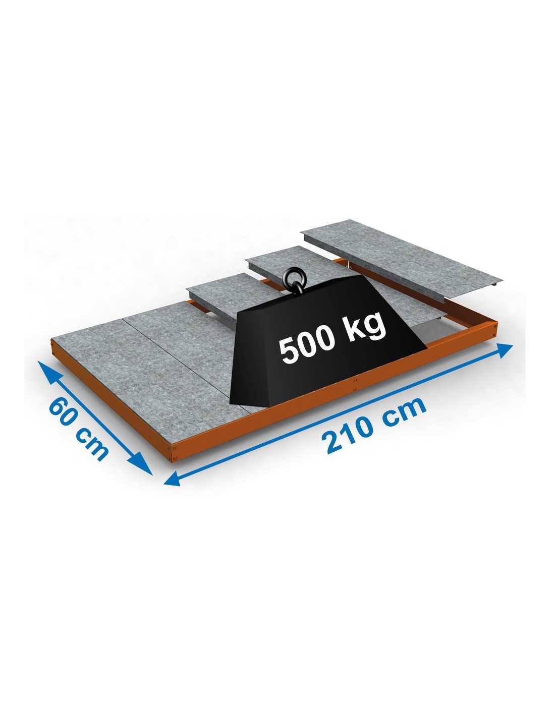 Estante adicional sin tornillos. Se monta de forma facil y comoda gracias a su sistema de click, sin tornillos simplemente con la ayuda de un martillo. La capacidad de carga es de 500 kgs. Incluye bandejas de metal. Incluye dos refuerzos. Medidas en uso del producto: 2110x610x70 mm