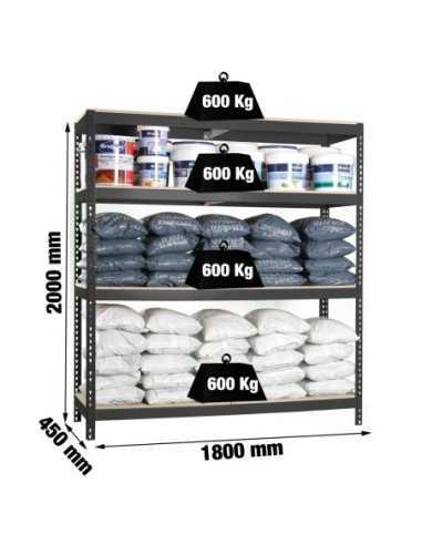 Estantería media carga sin tornillos 2000x1800x450 mm. De color ANTRACITA/madera. La capacidad de carga es de 600 kgs, certificamos a punto de flexi¢n, no de rotura. Incluye aglomerados. Tiene 4 alturas e incluye 8 bandejas de aglomerado.. Contiene 1 refuerzo por altura.