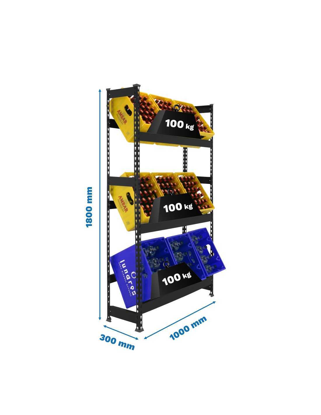 La Estantería Simonrack Simonbottle 3-1800x1000x300 antracita de SimonRack forma parte de la gama SIMONBOTTLE, estanterías metálicas modulares diseñadas para el almacenaje seguro y accesible de botellas, garrafas o envases similares. Su diseño sin tornillos permite un montaje rápido y su estructura inclinada mejora la visibilidad y el acceso a los productos.