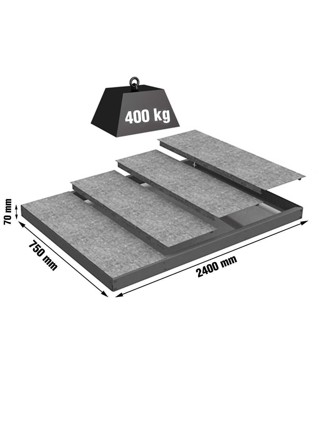 Estante adicional sin tornillos de color gris/galva con capacidad de carga por estante de 400 kg. El número de estantes es 1 y las medidas (alto x ancho x fondo) son 2400x750 mm. Tiene bandejas de metal. Producto español, calidad europea, podras encontrar las instrucciones de montaje en su interior o en este enlace: https://www.youtube.com/watch?v=whcjwzku_y0