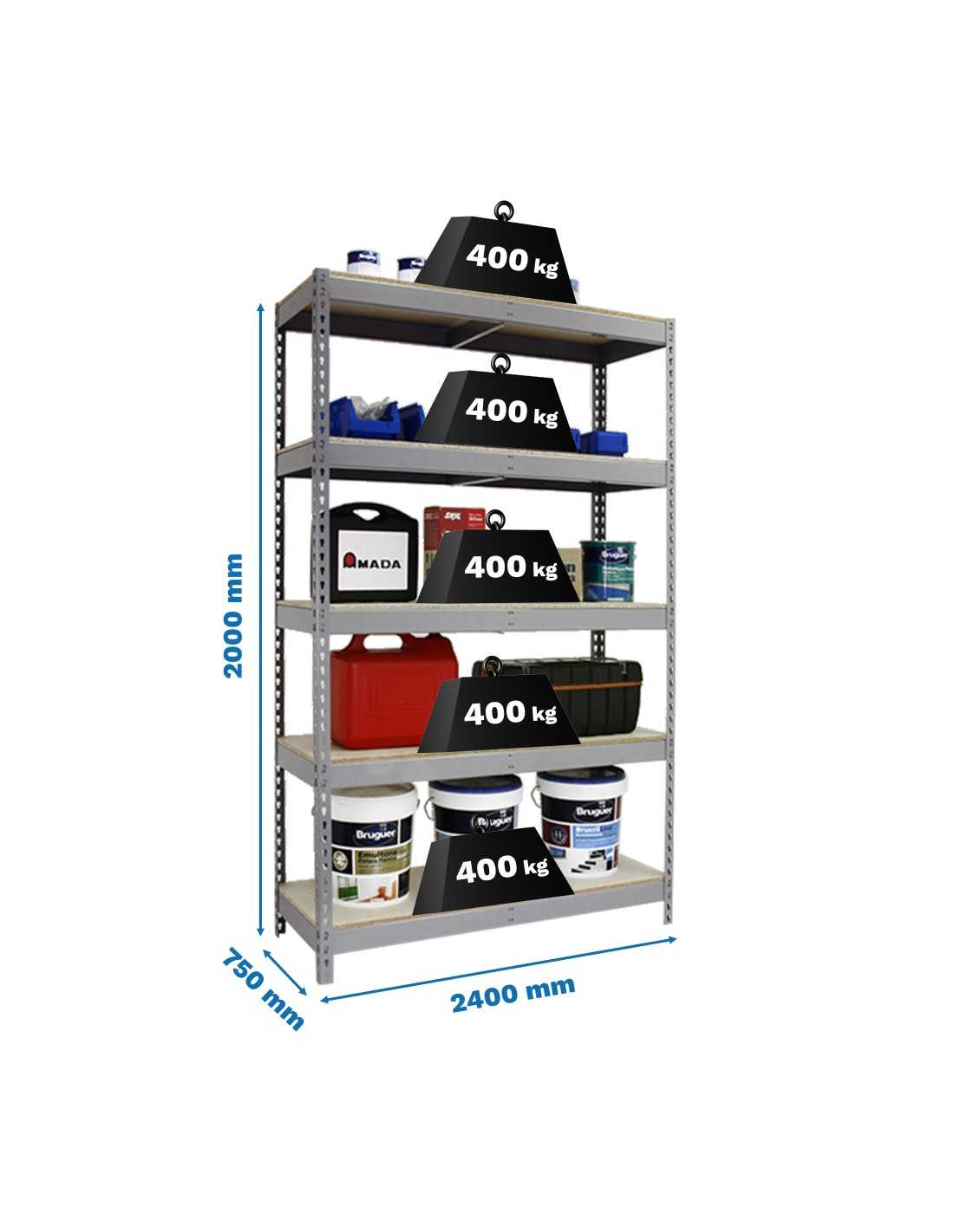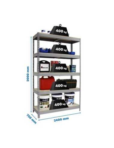 Estantería metálica sin tornillos de color gris/madera con capacidad de carga por estante de 400 kg. Ideal para taller. Tiene 5 alturas y 10 aglomerados, 2 por altura, uno más largo que el otro. Incluye 2 refuerzos por altura. Las medidas (alto x ancho x fondo) son 2000x2400x750 mm. Producto español, calidad europea, podrás encontrar las intrucciones de montaje en su interior o en este enlace: https://www.youtube.com/watch?v=whcjwzku_y0 . Medidas en uso del producto: 1975x2410x760 mm