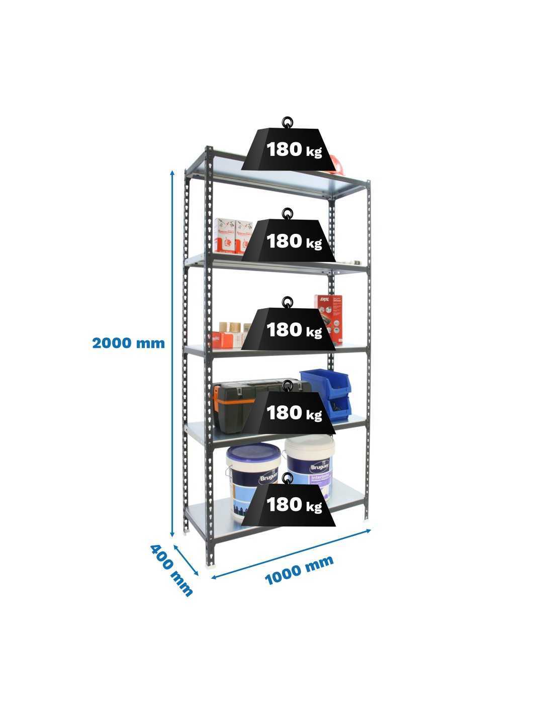 Estantería sin tornillos, bandeja metálica. Color: antracita/blanco.tiene 5 estantes. Dimensiones: 2000x1000x400 mm. Capacidad de carga: 180 kgs,certificamos a punto de flexi¢n, no de rotura. Unico sistema de ordenaci¢n del mundo que puede colocar las bandejas en posiciones diferentes: recta o estándar, inclinada y contenedora. Fabricado en España y se monta rápido siguiendo las instrucciones.