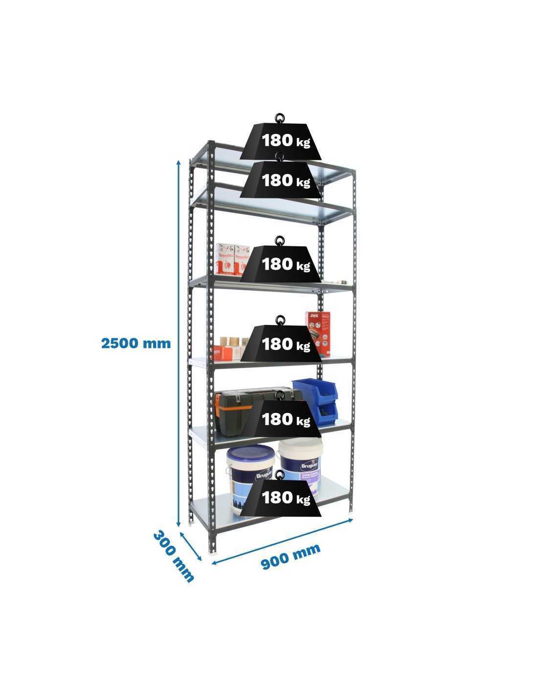 Estantería sin tornillos, bandeja metálica. Color: antracita/blanco.tiene 6 estantes. Dimensiones: 2500x900x300 mm. Capacidad de carga: 180 kgs,certificamos a punto de flexi¢n, no de rotura. Unico sistema de ordenaci¢n del mundo que puede colocar las bandejas en posiciones diferentes: recta o estándar, inclinada y contenedora. Fabricado en España y se monta rápido siguiendo las instrucciones.