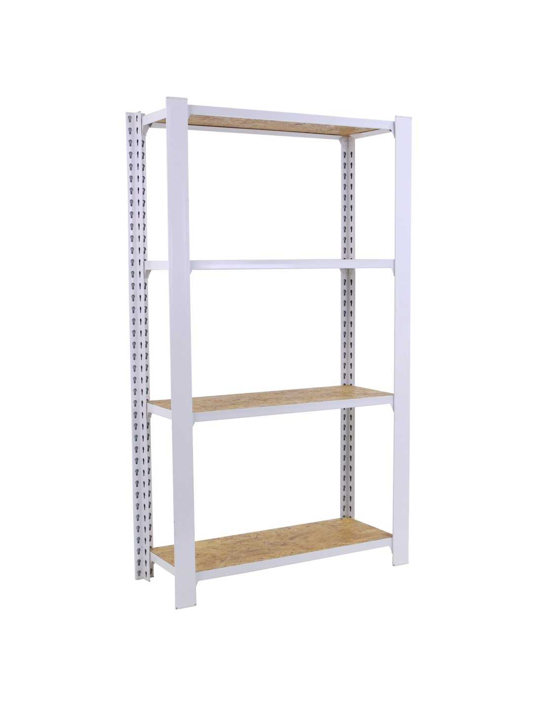 Estantería metálica sin tornillos de color blanco/osb con capacidad de carga por estante de 200 kg, certificación a punto de flexión. módulo inicial con bandejas de osb (tableros de virutas orientadas), tableros de alto rendimiento de grosor de 15 mm. Muy versátil enfocado a la decoración actual, donde su llamativo aspecto juega a su favor ya que por su apariencia industrial empasta completamente en ambientes modernos o vintage. El número de estantes es 4 y las medidas del producto (alto x ancho x fondo) son 1500x900x300 mm. Tiene perfil doble y en forma de T. Perfiles con recubrimiento epoxypoliester. No tiene aristas de corte, manipulación sin riesgo. No se tambalea y no necesita anclaje a la pared. Producto español, calidad europea, podrás encontrar las instrucciones de montaje en su interior.