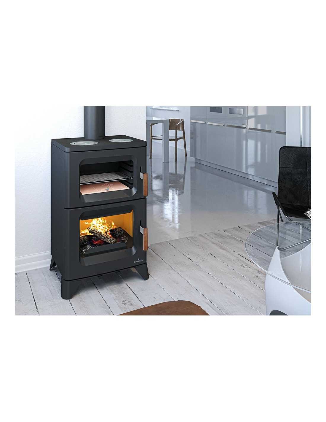 La principal ventaja para el usuario es la **versatilidad**. Además de proporcionar un calor confortable y duradero, el horno superior, equipado con ladrillo refractario y termómetro de 400 °C, permite asar y cocinar mientras se calienta la estancia. Las manetas con acabado de madera natural añaden un toque estético y funcional, protegiendo al usuario del calor. Además, es un Modelo Estanco opcional (KIT-AIR-15), ideal para viviendas de bajo consumo y casas pasivas.