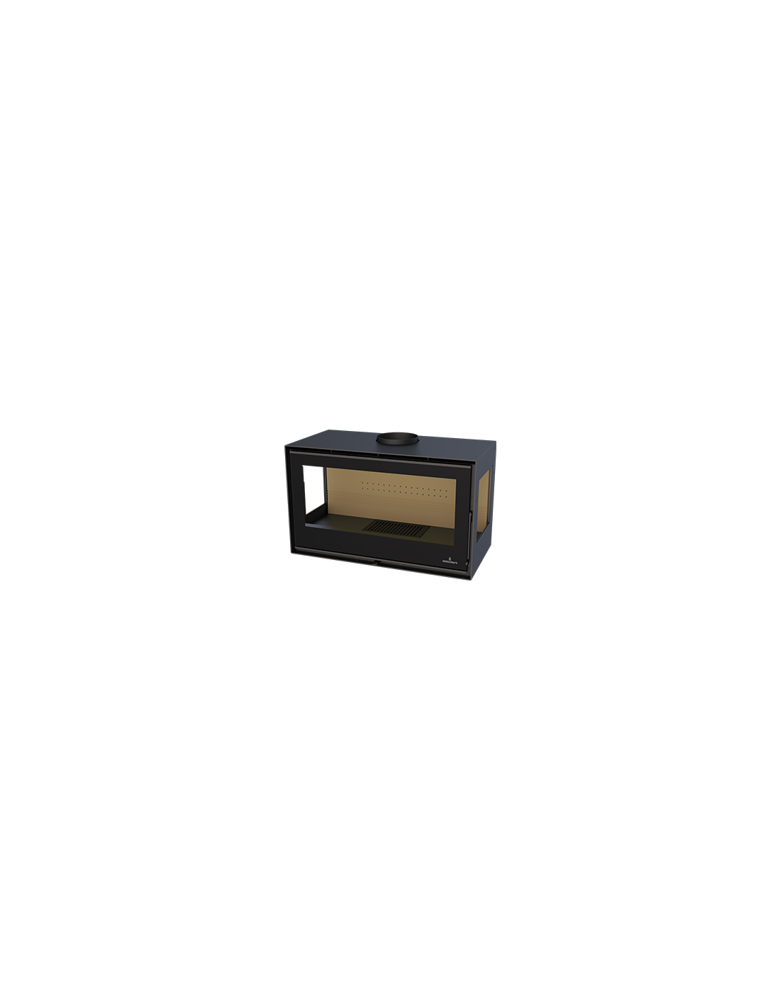 El insertable cuenta con tres caras de cristal que permiten una visión panorámica del fuego. Estos cristales llevan un elegante serigrafiado negro en los bordes, lo que no solo ofrece un acabado moderno y elegante, sino que también enmarca la llama, ocultando las uniones metálicas y creando un impacto visual superior, mejorando la estética del conjunto.