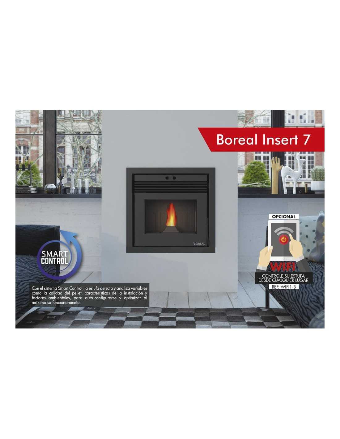 El Insertable de Pellet Boreal Insert 7 representa la evolución inteligente en sistemas de calefacción para el hogar. Este equipo ha sido diseñado para integrarse con elegancia en chimeneas existentes o nuevos proyectos, ofreciendo la calidez del fuego tradicional con la comodidad y eficiencia de la tecnología de biomasa. Fabricado con un robusto cuerpo de chapa de acero y acabados de alta calidad, es capaz de resistir las exigencias térmicas más severas gracias a su pintura anticalórica resistente a 650°C. Lo que hace único al Boreal Insert 7 es su avanzado cerebro electrónico. Gracias al sistema Smart Control, el insertable es capaz de detectar y analizar variables críticas como la calidad del pellet utilizado, las características específicas de su instalación y los factores ambientales externos. Con esta información, el equipo se auto-configura en tiempo real para optimizar la combustión, garantizando un rendimiento excepcional de hasta el 94%. El beneficio directo para el usuario es un ahorro significativo en combustible y una experiencia de uso simplificada. Con una potencia máxima de 7 kW, es ideal para calentar estancias de hasta 158 m³. Su diseño compacto no sacrifica la autonomía, ya que dispone de un depósito de 16 kg y un sensor de nivel de carga que le mantendrá informado en todo momento sobre el estado del pellet. Además, su sistema de cristal limpio asegura que la visión de la llama sea siempre nítida y espectacular.