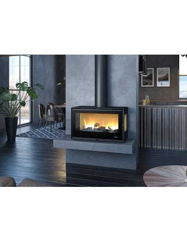 Este modelo se distingue por su innovador diseño de tres cristales, que ofrece una visión panorámica espectacular del fuego, permitiendo que las llamas se conviertan en el centro de atención desde múltiples ángulos.