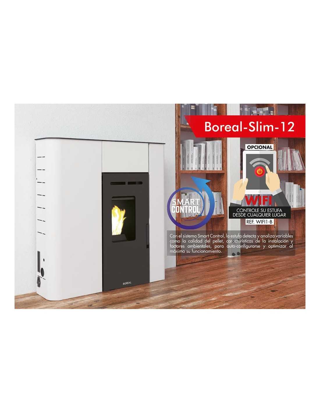 La Boreal Slim 12 está especialmente dirigida a propietarios de viviendas modernas o pisos donde el espacio es un factor crítico. Es el producto ideal para instalar en pasillos o estancias estrechas donde se requiera una gran potencia térmica sin obstaculizar el paso. Su diseño en tres colores (Gris, Negro y Marfil) permite integrarla estéticamente en cualquier estilo decorativo. Recomendamos encarecidamente la adquisición del KIT WIFI para aquellos usuarios que deseen gestionar el confort de su hogar antes de llegar a casa, permitiendo programar encendidos y ajustar la temperatura desde el móvil. Asimismo, es una opción excelente para quienes necesiten calentar una habitación contigua mediante su sistema de canalización de aire. Si busca una estufa eficiente, silenciosa y con la última tecnología en combustión de biomasa, la Boreal Slim 12 es la elección más equilibrada para el ahorro en calefacción.