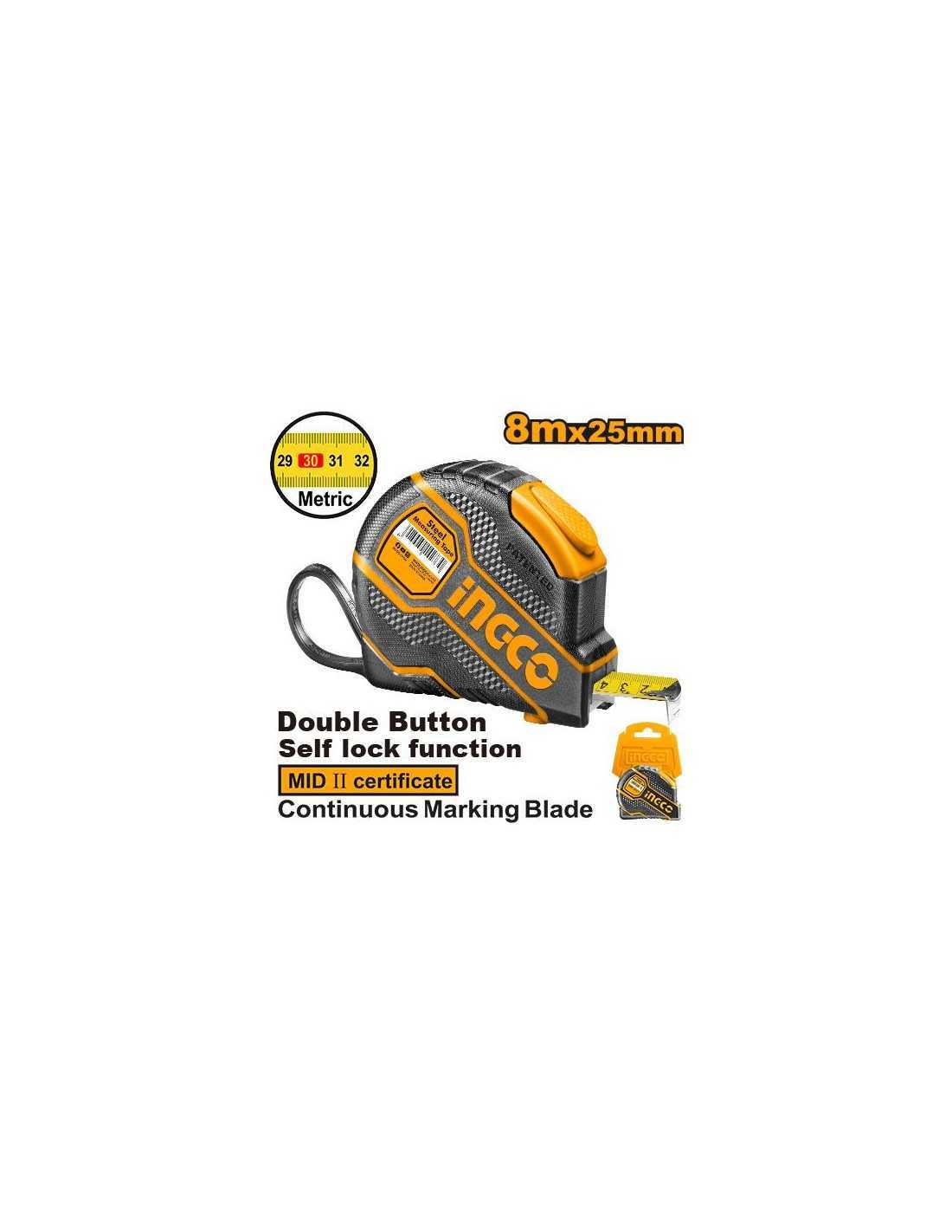 El flexómetro pro INGCO HSMT08081E es un instrumento de medición precisa con una longitud de 8 metros y ancho de 25 mm. Con certificación MID II, función de autobloqueo, botón doble y cubierta de goma, este flexómetro ofrece fiabilidad y precisión en diversas aplicaciones de medición.