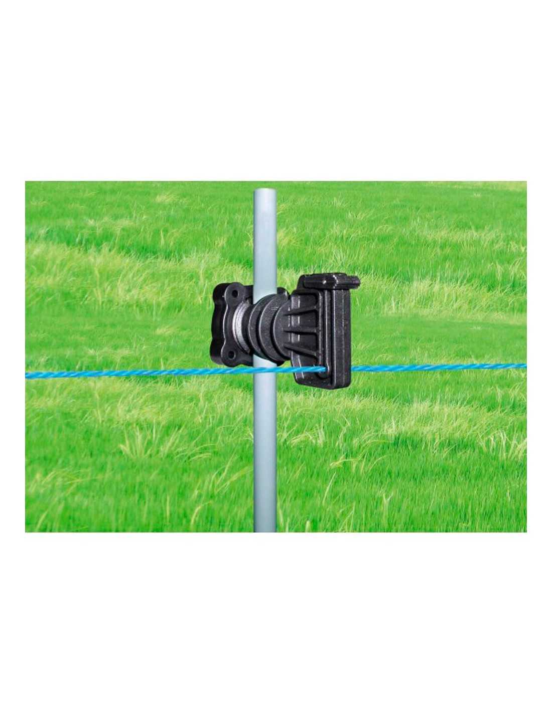 Su diseño regulable permite adaptarse a diferentes tipos de conductores, incluyendo cable, hilo y cinta de hasta 40 mm de ancho. Ideal para ferralla y postes de fibra de hasta 16 mm de diámetro, este aislador es perfecto para instalaciones ganaderas y agrícolas que requieren flexibilidad y resistencia.