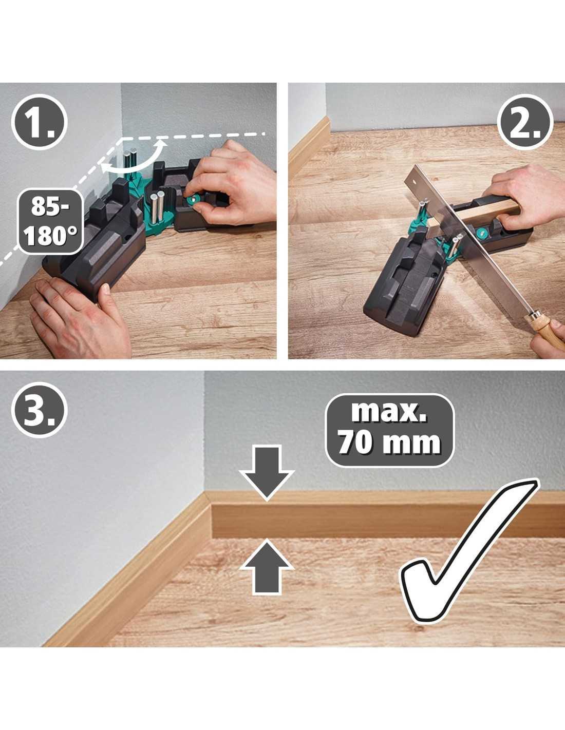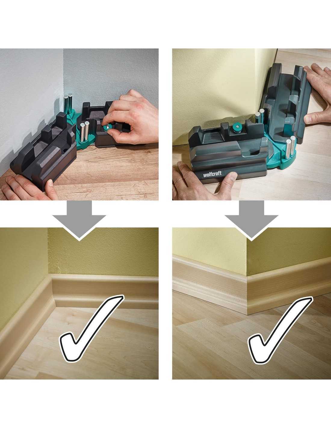La caja de ingletar y falsa escuadra de Wolfcraft es una herramienta 2 en 1 diseñada para facilitar la medición y el corte de ángulos precisos en rodapiés y otros elementos de carpintería. Esta herramienta combina las funciones de una caja de ingletes y una falsa escuadra, lo que permite medir ángulos de 85° a 180° y transferirlos directamente a la sierra para realizar cortes de inglete perfectos. Su diseño intuitivo y fácil de usar la convierte en una herramienta indispensable tanto para profesionales como para aficionados al bricolaje que buscan resultados precisos y profesionales.