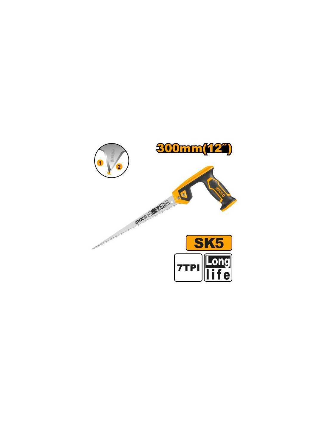 Este artículo presenta la sierra compass INGCO HCS3008, una herramienta manual diseñada para cortes precisos en madera. Con una longitud de 300 mm, tratamiento térmico, y 7 TPI SK5, esta sierra ofrece dos filos de dientes rectificados para un corte uniforme y eficiente. Su mango compuesto con material polimérico de dos componentes proporciona un agarre seguro y evita el deslizamiento.