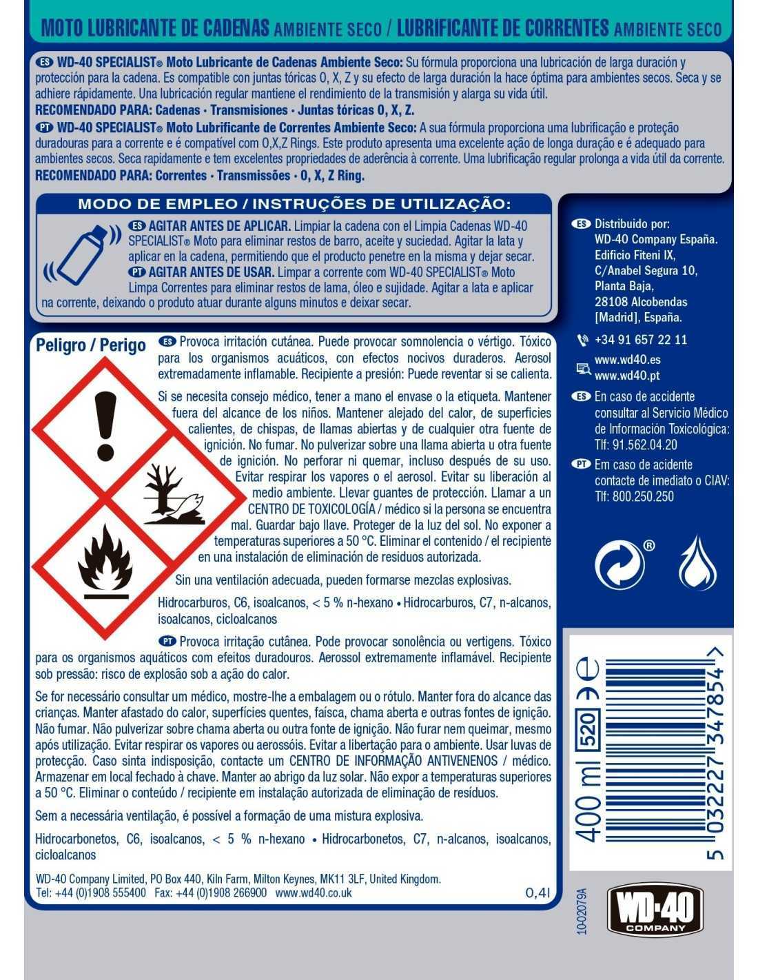 El SPECIALIST®MOTO Lubricante de Cadenas Ambiente Seco WD-40 400 ml es una solución eficaz y versátil para múltiples tareas de mantenimiento. Diseñado para facilitar el trabajo en condiciones exigentes, este producto ofrece resultados profesionales tanto en entornos domésticos como industriales.