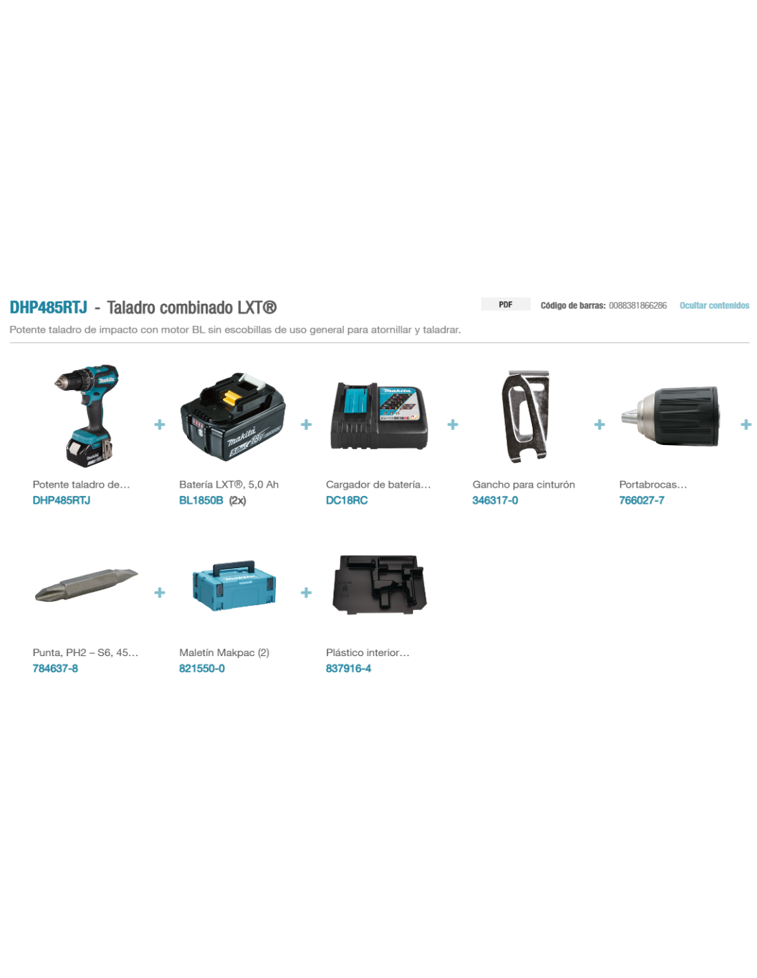 El taladro de impacto DHP485RTJ de 18V con 50 Nm de potencia es una herramienta versátil, con motor BL sin escobillas y luz LED integrada. Incluye dos baterías de 5.0Ah y un cargador rápido en un maletín Makpac. Ideal para atornillar, taladrar con o sin percusión. Perfecto para instaladores, constructores y personal de mantenimiento.