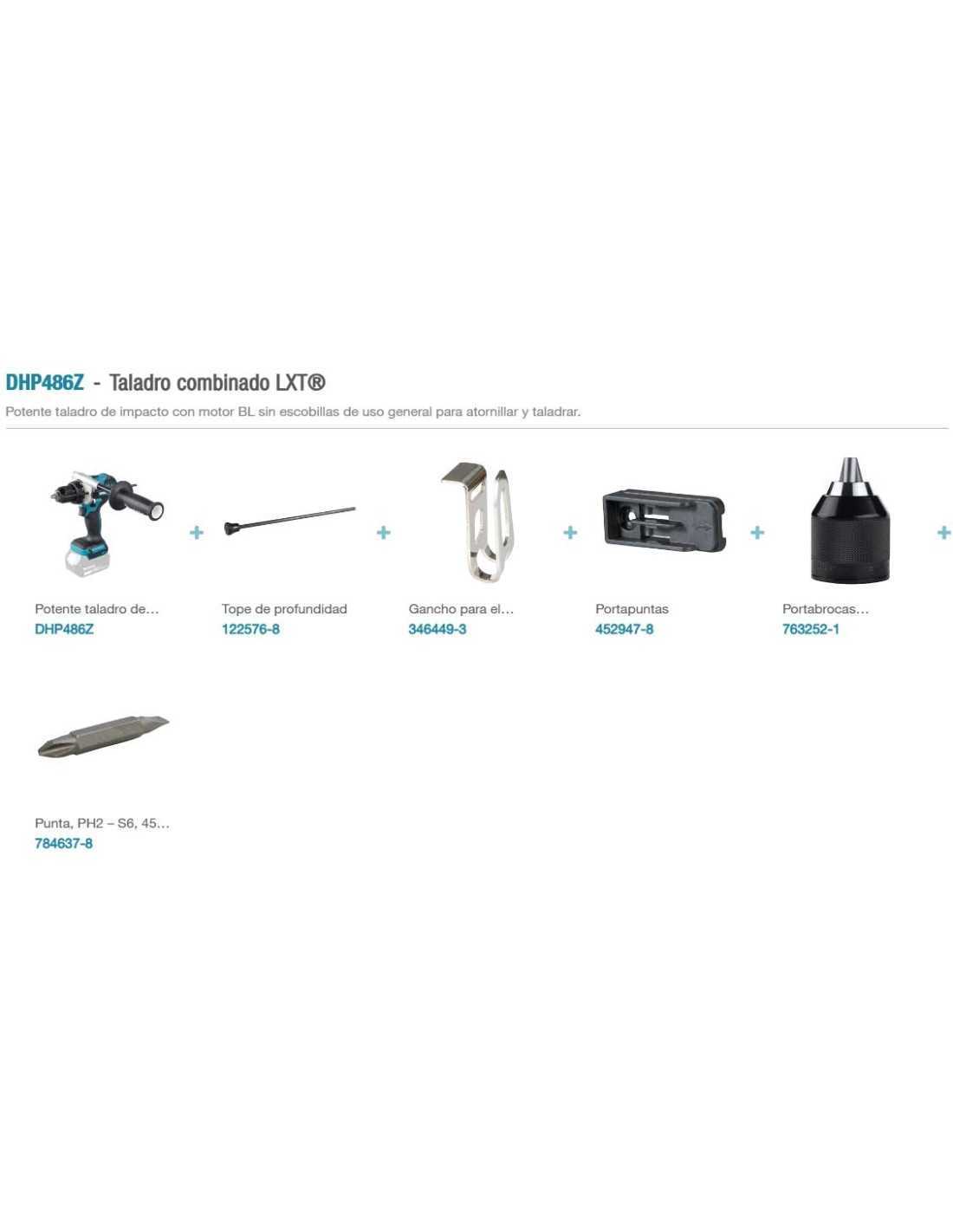 5. Contenido del paquete El paquete incluye el Taladro Combinado LXT®DHP486Z, un tope de profundidad, un gancho para el cinturón, un portapuntas, un portabrocas automático de 13 mm, una punta PH2 – S6 de 45 mm.