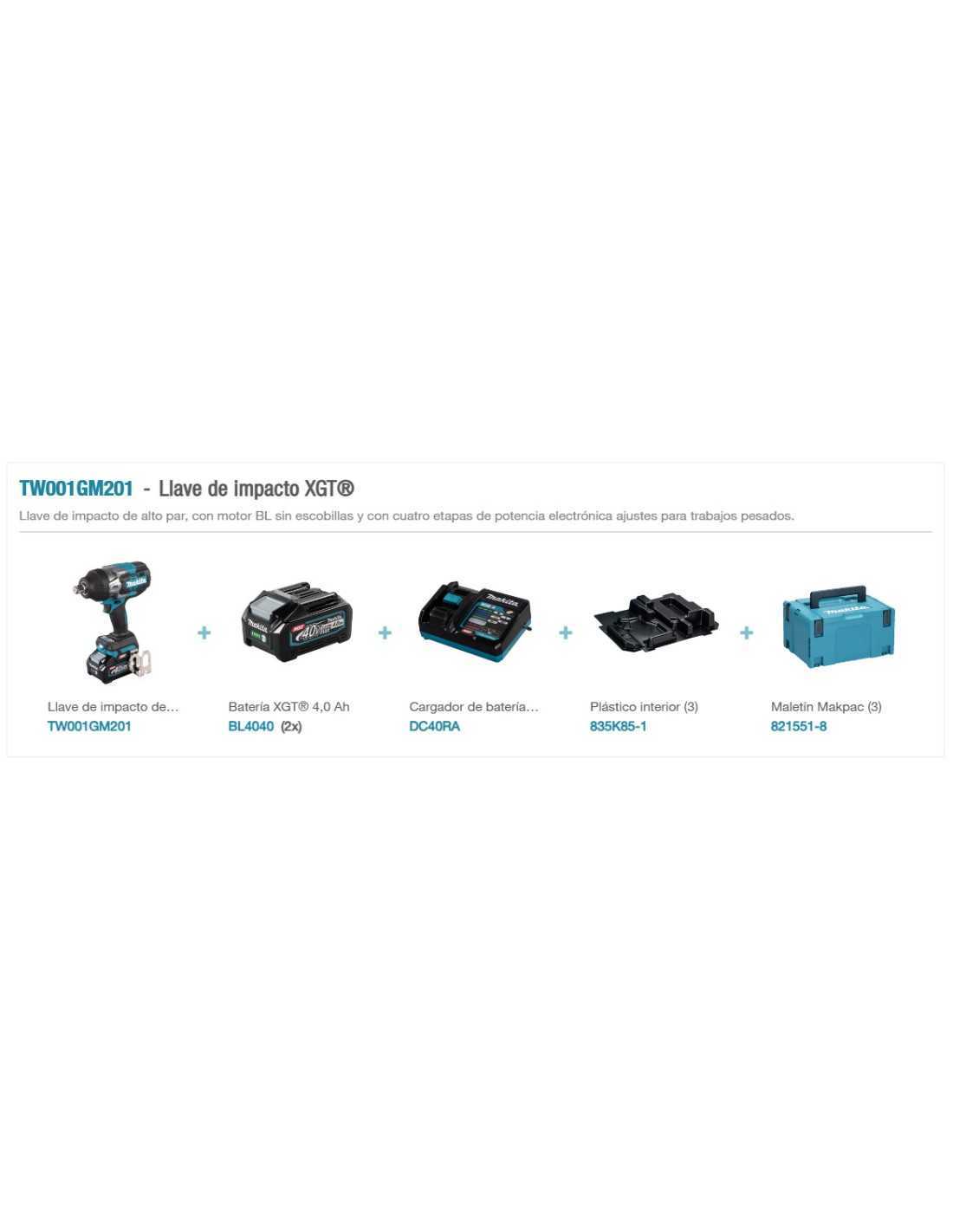 La Makita TW001GM201 es una llave de impacto inalámbrica con un motor BL sin escobillas, de 3/4" con un par de apriete de hasta 1.800 Nm. Cuenta con una selección electrónica de potencia en 4 etapas y está equipada con 2 luces LED para mayor iluminación, lo que la hace ideal para aplicaciones que requieren un alto par de apriete.