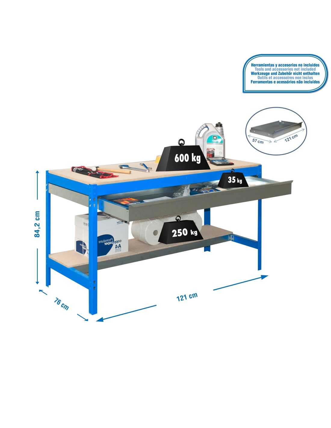 Con estructura metálica de alta resistencia y superficies amplias, esta mesa permite trabajar con total estabilidad, incluso con maquinaria, herramientas o componentes de peso. Ideal para talleres, garajes, almacenes o espacios técnicos.