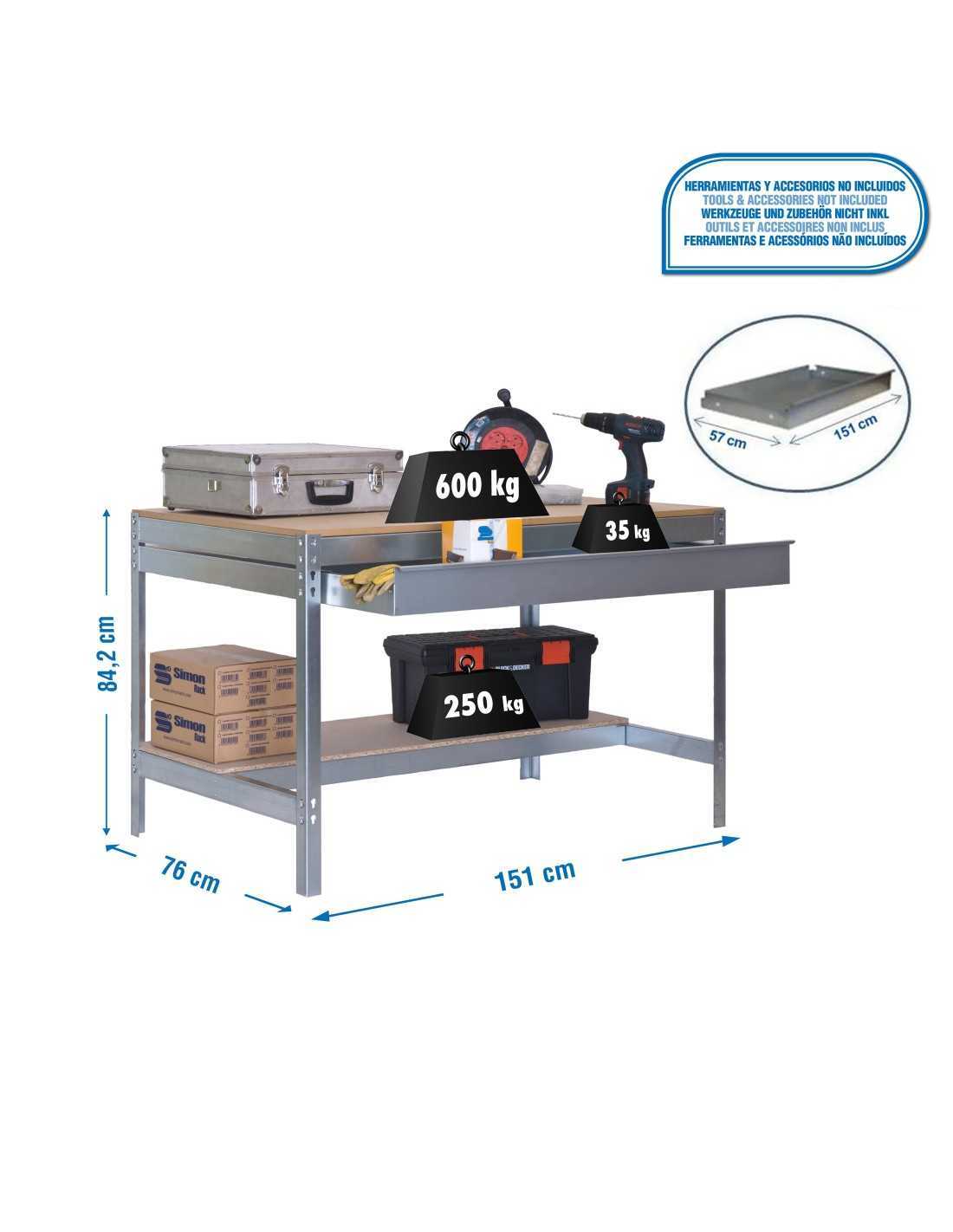 Especificaciones técnicas de la Mesa de Trabajo SIMONWORK BT 0 box 1500 galva/madera